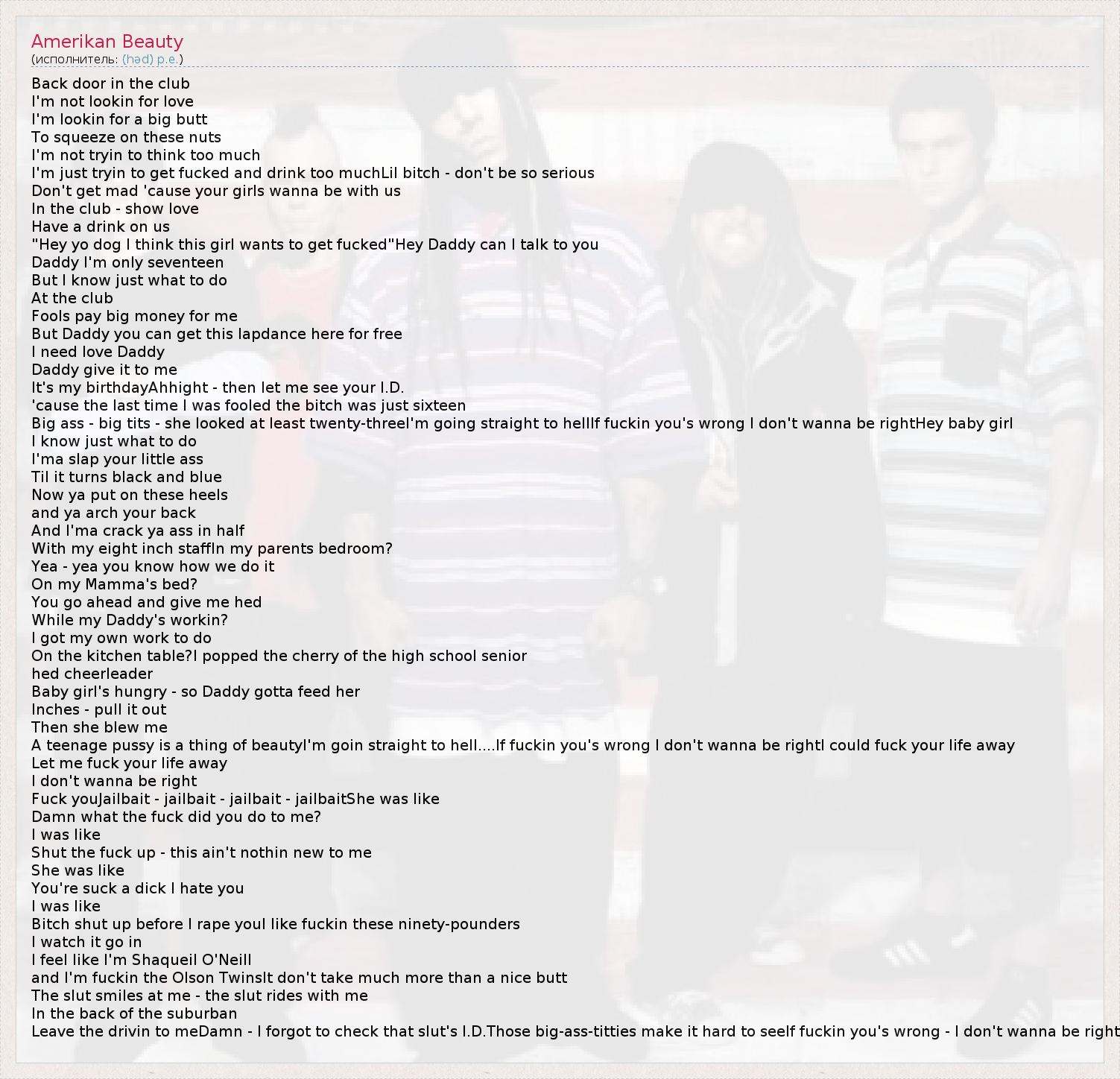 Back door in the club I'm not lookin for love I'm lookin for a big butt To squeeze on these nuts I'm not tryin to think too much I'm just tryin to get fucked and drink too muchLil bitch - don't be so serious Don't get mad 'cause your girls wanna be with us In the club - show love Have a drink on us "Hey yo dog I think this girl wants to get fucked"Hey Daddy can I talk to you Daddy I'm only seventeen But I know just what to do At the club Fools pay big money for me But Daddy you can get this lapdance here for free I need love Daddy Daddy give it to me It's my birthdayAhhight - then let me see your I.D. 'cause the last time I was fooled the bitch was just sixteen Big ass - big tits - she looked at least twenty-threeI'm going straight to hellIf fuckin you's wrong I don't wanna be rightHey baby girl I know just what to do I'ma slap your little ass Til it turns black and blue Now ya put on these heels and ya arch your back And I'ma crack ya ass in half With my eight inch staffIn my parents bedroom? Yea - yea you know how we do it On my Mamma's bed? You go ahead and give me hed While my Daddy's workin? I got my own work to do On the kitchen table?I popped the cherry of the high school senior hed cheerleader Baby girl's hungry - so Daddy gotta feed her Inches - pull it out Then she blew me A teenage pussy is a thing of beautyI'm goin straight to hell....If fuckin you's wrong I don't wanna be rightI could fuck your life away Let me fuck your life away I don't wanna be right Fuck youJailbait - jailbait - jailbait - jailbaitShe was like Damn what the fuck did you do to me? I was like Shut the fuck up - this ain't nothin new to me She was like You're suck a dick I hate you I was like Bitch shut up before I rape youI like fuckin these ninety-pounders I watch it go in I feel like I'm Shaqueil O'Neill and I'm fuckin the Olson TwinsIt don't take much more than a nice butt The slut smiles at me - the slut rides with me In the back of the suburban Leave the drivin to meDamn - I forgot to check that slut's I.D.Those big-ass-titties make it hard to seeIf fuckin you's wrong - I don't wanna be right