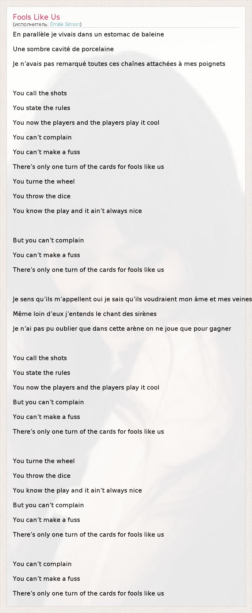 En parallèle je vivais dans un estomac de baleine Une sombre cavité de porcelaine Je n’avais pas remarqué toutes ces chaînes attachées à mes poignets You call the shots You state the rules You now the players and the players play it cool You can’t complain You can’t make a fuss There’s only one turn of the cards for fools like us You turne the wheel You throw the dice You know the play and it ain’t always nice But you can’t complain You can’t make a fuss There’s only one turn of the cards for fools like us Je sens qu’ils m’appellent oui je sais qu’ils voudraient mon âme et mes veines Même loin d’eux j’entends le chant des sirènes Je n’ai pas pu oublier que dans cette arène on ne joue que pour gagner You call the shots You state the rules You now the players and the players play it cool But you can’t complain You can’t make a fuss There’s only one turn of the cards for fools like us You turne the wheel You throw the dice You know the play and it ain’t always nice But you can’t complain You can’t make a fuss There’s only one turn of the cards for fools like us You can’t complain You can’t make a fuss There’s only one turn of the cards for fools like us