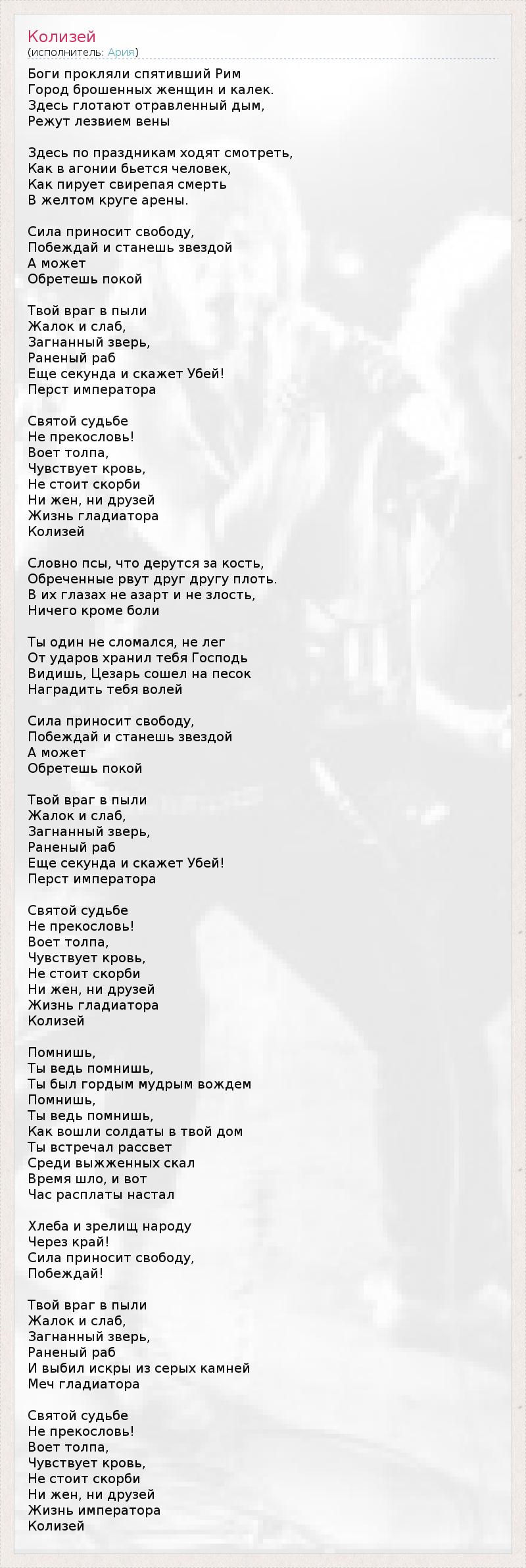 Ария - Колизей http://megalyrics.ru/lyric/%D0%B0%D1%80%D0%B8%D1%8F/%D0%BA%D0%BE%D0%BB%D0%B8%D0%B7%D0%B5%D0%B9.htm#ixzz1wvJTS6ub