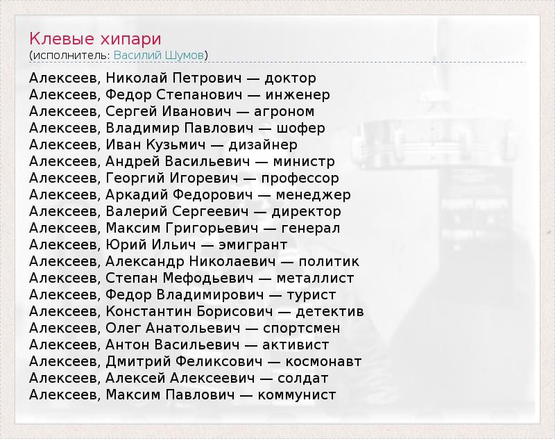 Это интересно:Васи́лий Гера́рдович Шу́мов (род. 23 марта 1960 г.) — русско-американский музыкант, поэт, деятель искусcтва, режиссёр. Известен как лидер группы Центр (Москва, Лос-Анджелес)и автор проектов мультимедийного и экспериментального искуcства. Делает музыку в стилях новая волна, электронная музыка, авангард и других.В конце 1970х собрал группу «777»,... продолжение