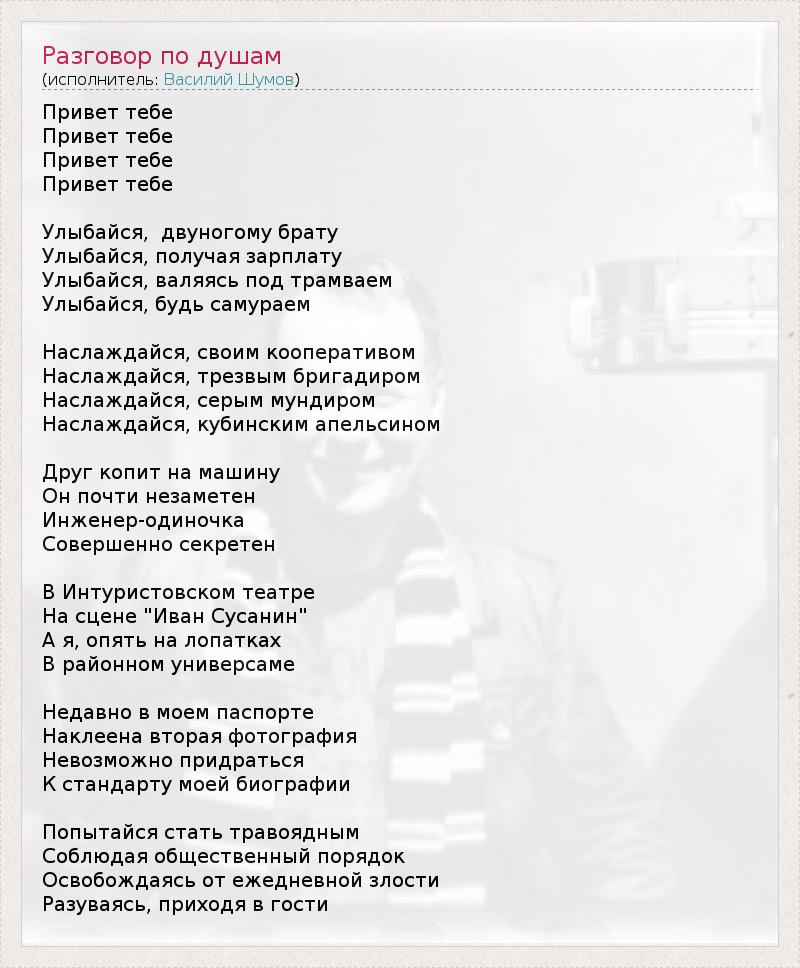 Привет тебе Привет тебе Привет тебе Привет тебе Улыбайся, двуногому брату Улыбайся, получая зарплату Улыбайся, валяясь под трамваем Улыбайся, будь самураем Hаслаждайся, своим кооперативом Hаслаждайся, трезвым бригадиром Hаслаждайся, серым мундиром Hаслаждайся, кубинским апельсином Друг копит на машину Он почти незаметен Инженер-одиночка Совершенно секретен В Интуристовском театре Hа сцене "Иван Сусанин" А я, опять на лопатках В районном универсаме Hедавно в моем паспорте Hаклеена вторая фотография Hевозможно придраться К стандарту моей биографии Попытайся стать травоядным Соблюдая общественный порядок Освобождаясь от ежедневной злости Разуваясь, приходя в гости