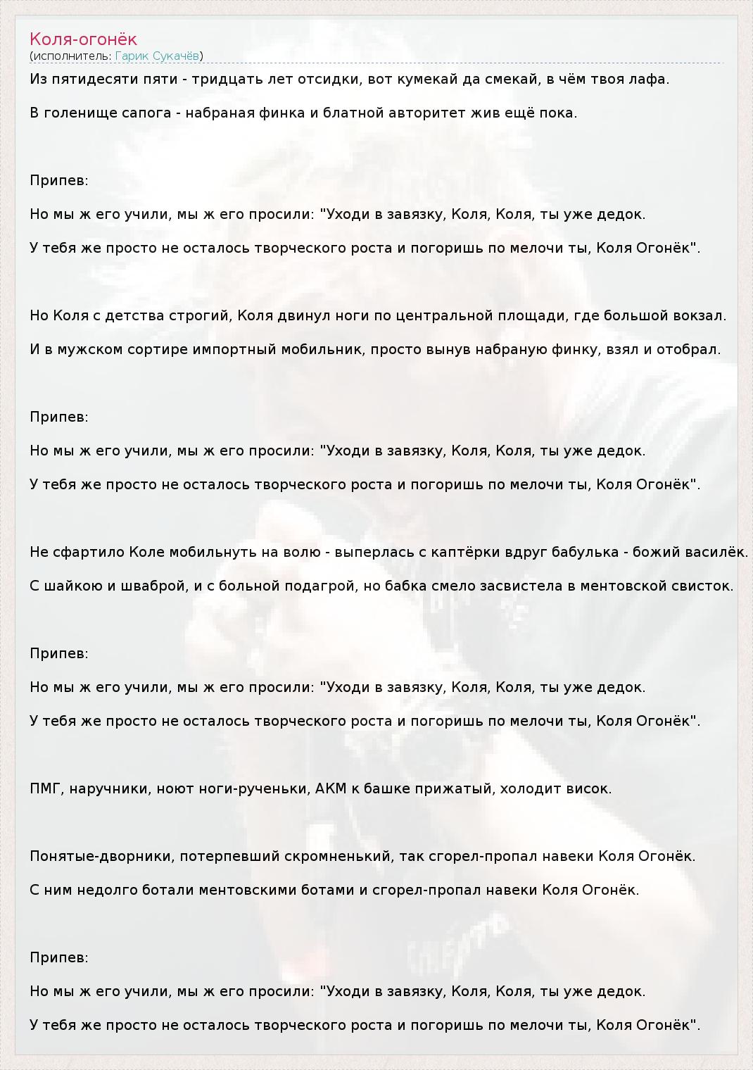 Из пятидесяти пяти - тридцать лет отсидки, вот кумекай да смекай, в чём твоя лафа. В голенище сапога - набраная финка и блатной авторитет жив ещё пока. Припев: Но мы ж его учили, мы ж его просили: "Уходи в завязку, Коля, Коля, ты уже дедок. У тебя же просто не осталось творческого роста и погоришь по мелочи ты, Коля Огонёк". Но Коля с детства строгий, Коля двинул ноги по центральной площади, где большой вокзал. И в мужском сортире импортный мобильник, просто вынув набраную финку, взял и отобрал. Припев: Но мы ж его учили, мы ж его просили: "Уходи в завязку, Коля, Коля, ты уже дедок. У тебя же просто не осталось творческого роста и погоришь по мелочи ты, Коля Огонёк". Не сфартило Коле мобильнуть на волю - выперлась с каптёрки вдруг бабулька - божий василёк. С шайкою и шваброй, и с больной подагрой, но бабка смело засвистела в ментовской свисток. Припев: Но мы ж его учили, мы ж его просили: "Уходи в завязку, Коля, Коля, ты уже дедок. У тебя же просто не осталось творческого роста и погоришь по мелочи ты, Коля Огонёк". ПМГ, наручники, ноют ноги-рученьки, АКМ к башке прижатый, холодит висок. Понятые-дворники, потерпевший скромненький, так сгорел-пропал навеки Коля Огонёк. С ним недолго ботали ментовскими ботами и сгорел-пропал навеки Коля Огонёк. Припев: Но мы ж его учили, мы ж его просили: "Уходи в завязку, Коля, Коля, ты уже дедок. У тебя же просто не осталось творческого роста и погоришь по мелочи ты, Коля Огонёк".