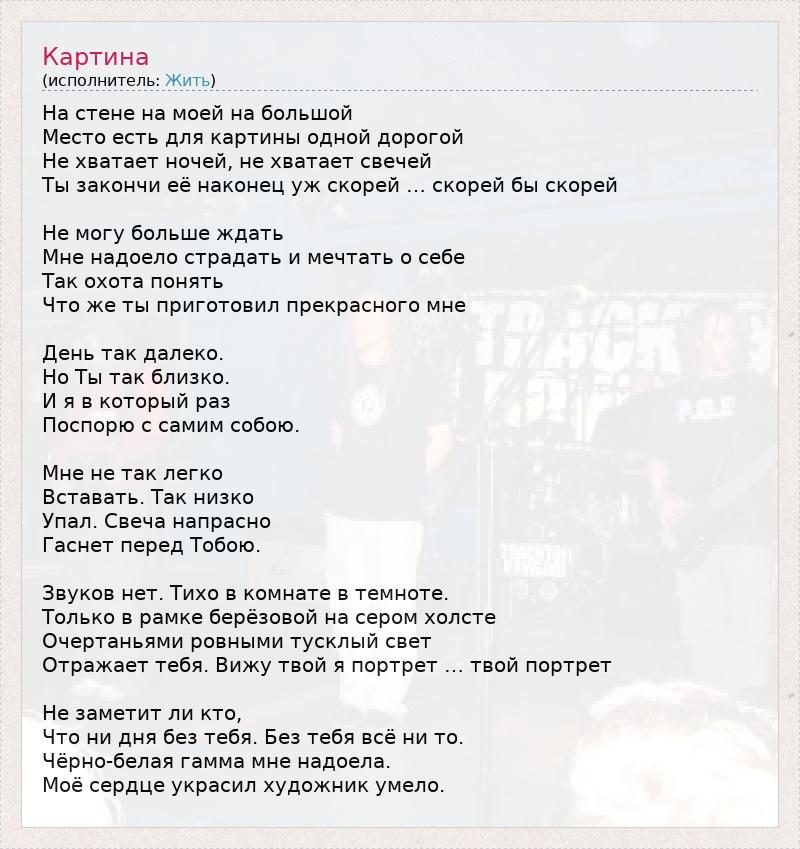 На стене на моей на большой Место есть для картины одной дорогой Не хватает ночей, не хватает свечей Ты закончи её наконец уж скорей … скорей бы скорей Не могу больше ждать Мне надоело страдать и мечтать о себе Так охота понять Что же ты приготовил прекрасного мне День так далеко. Но Ты так близко. И я в который раз Поспорю с самим собою. Мне не так легко Вставать. Так низко Упал. Свеча напрасно Гаснет перед Тобою. Звуков нет. Тихо в комнате в темноте. Только в рамке берёзовой на сером холсте Очертаньями ровными тусклый свет Отражает тебя. Вижу твой я портрет … твой портрет Не заметит ли кто, Что ни дня без тебя. Без тебя всё ни то. Чёрно-белая гамма мне надоела. Моё сердце украсил художник умело.