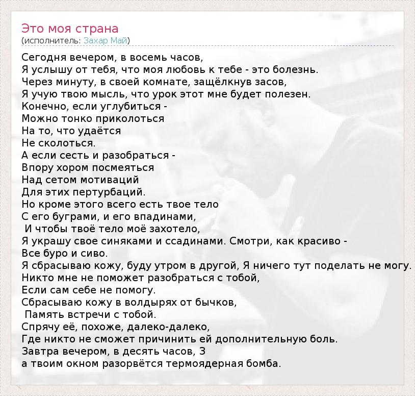 Сегодня вечером, в восемь часов, Я услышу от тебя, что моя любовь к тебе - это болезнь. Через минуту, в своей комнате, защёлкнув засов, Я учую твою мысль, что урок этот мне будет полезен. Конечно, если углубиться - Можно тонко приколоться На то, что удаётся Не сколоться. А если сесть и разобраться - Впору хором посмеяться Над сетом мотиваций Для этих пертурбаций. Но кроме этого всего есть твое тело С его буграми, и его впадинами, И чтобы твоё тело моё захотело, Я украшу свое синяками и ссадинами. Смотри, как красиво - Все буро и сиво. Я сбрасываю кожу, буду утром в другой, Я ничего тут поделать не могу. Никто мне не поможет разобраться с тобой, Если сам себе не помогу. Сбрасываю кожу в волдырях от бычков, Память встречи с тобой. Спрячу её, похоже, далеко-далеко, Где никто не сможет причинить ей дополнительную боль. Завтра вечером, в десять часов, З а твоим окном разорвётся термоядерная бомба.