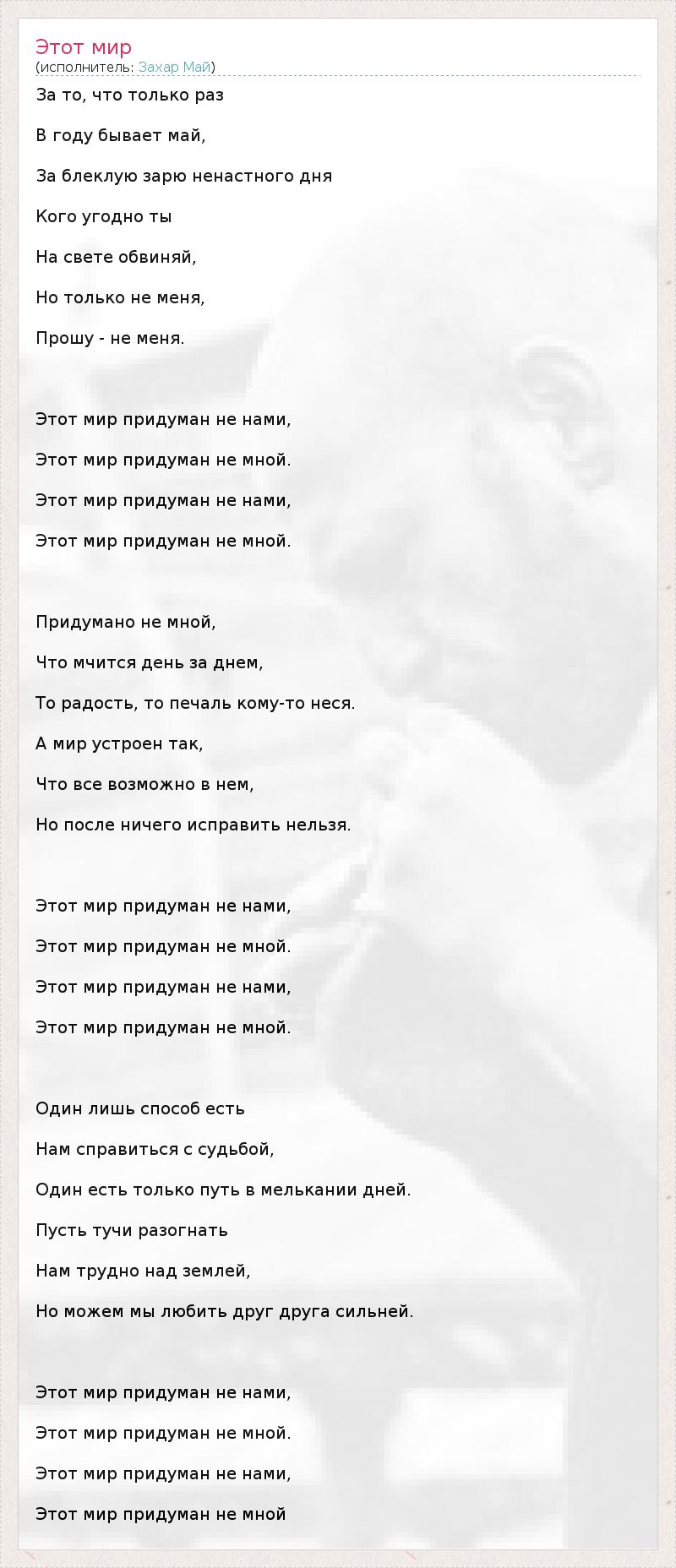 За то, что только раз В году бывает май, За блеклую зарю ненастного дня Кого угодно ты На свете обвиняй, Но только не меня, Прошу - не меня. Этот мир придуман не нами, Этот мир придуман не мной. Этот мир придуман не нами, Этот мир придуман не мной. Придумано не мной, Что мчится день за днем, То радость, то печаль кому-то неся. А мир устроен так, Что все возможно в нем, Но после ничего исправить нельзя. Этот мир придуман не нами, Этот мир придуман не мной. Этот мир придуман не нами, Этот мир придуман не мной. Один лишь способ есть Нам справиться с судьбой, Один есть только путь в мелькании дней. Пусть тучи разогнать Нам трудно над землей, Но можем мы любить друг друга сильней. Этот мир придуман не нами, Этот мир придуман не мной. Этот мир придуман не нами, Этот мир придуман не мной