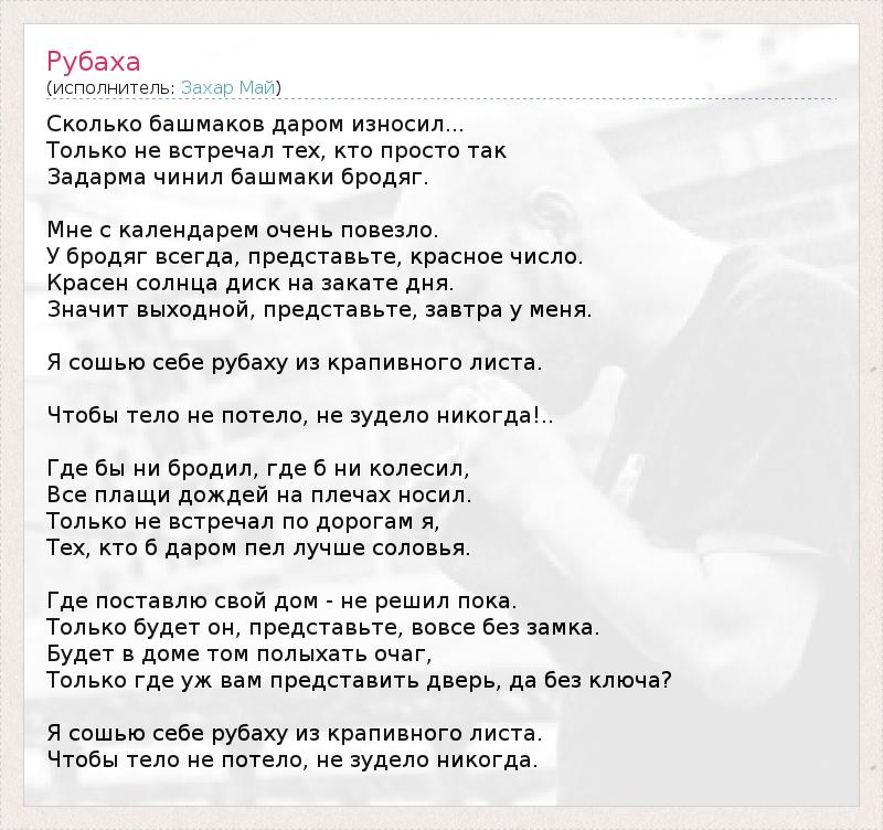 Сколько башмаков даром износил... Только не встречал тех, кто просто так Задарма чинил башмаки бродяг. Мне с календарем очень повезло. У бродяг всегда, представьте, красное число. Красен солнца диск на закате дня. Значит выходной, представьте, завтра у меня. Я сошью себе рубаху из крапивного листа. Чтобы тело не потело, не зудело никогда!.. Где бы ни бродил, где б ни колесил, Все плащи дождей на плечах носил. Только не встречал по дорогам я, Тех, кто б даром пел лучше соловья. Где поставлю свой дом - не решил пока. Только будет он, представьте, вовсе без замка. Будет в доме том полыхать очаг, Только где уж вам представить дверь, да без ключа? Я сошью себе рубаху из крапивного листа. Чтобы тело не потело, не зудело никогда.