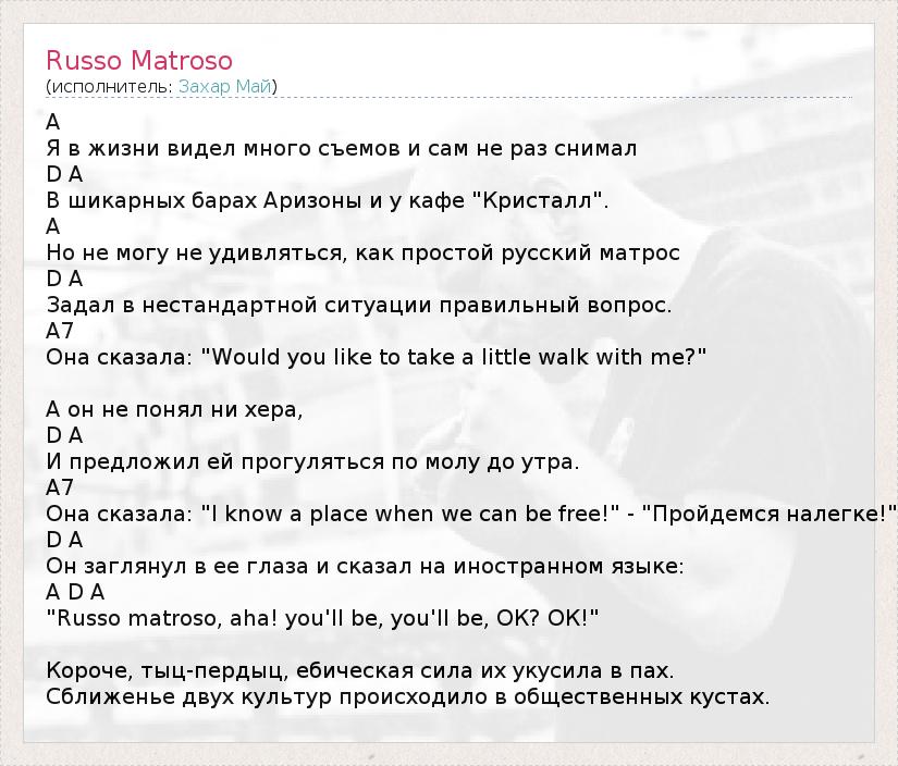 A Я в жизни видел много съемов и сам не раз снимал D A В шикарных барах Аризоны и у кафе "Кристалл". A Но не могу не удивляться, как простой русский матрос D A Задал в нестандартной ситуации правильный вопрос. A7 Она сказала: "Would you like to take a little walk with me?" А он не понял ни хера, D A И предложил ей прогуляться по молу до утра. A7 Она сказала: "I know a place when we can be free!" - "Пройдемся налегке!" D A Он заглянул в ее глаза и сказал на иностранном языке: A D A "Russo matroso, aha! you'll be, you'll be, ОК? ОК!" Короче, тыц-пердыц, ебическая сила их укусила в пах. Сближенье двух культур происходило в общественных кустах.