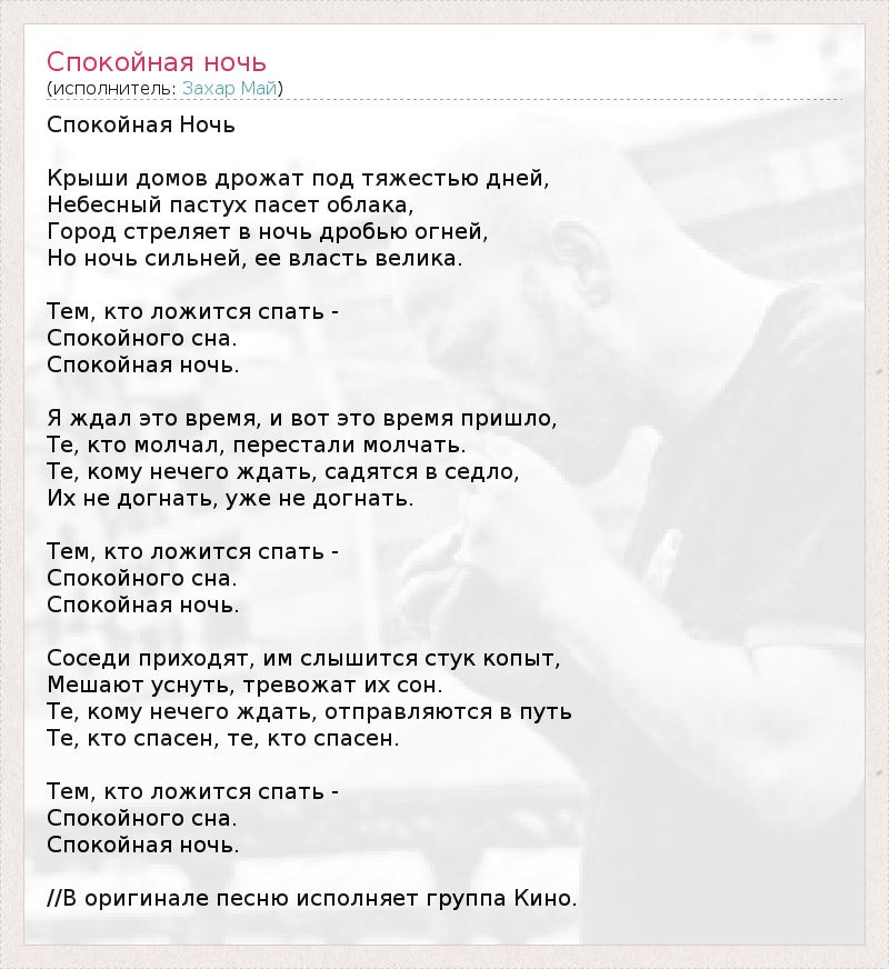 Спокойная Ночь Крыши домов дрожат под тяжестью дней, Небесный пастух пасет облака, Город стреляет в ночь дробью огней, Но ночь сильней, ее власть велика. Тем, кто ложится спать - Спокойного сна. Спокойная ночь. Я ждал это время, и вот это время пришло, Те, кто молчал, перестали молчать. Те, кому нечего ждать, садятся в седло, Их не догнать, уже не догнать. Тем, кто ложится спать - Спокойного сна. Спокойная ночь. Соседи приходят, им слышится стук копыт, Мешают уснуть, тревожат их сон. Те, кому нечего ждать, отправляются в путь Те, кто спасен, те, кто спасен. Тем, кто ложится спать - Спокойного сна. Спокойная ночь. //В оригинале песню исполняет группа Кино.