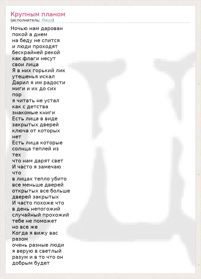 Ночью нам дарован покой а днем на беду не спится и люди проходят бескрайней рекой как флаги несут свои лица Я в них горький лик утешенья искал Дарил я им радости миги и их до сих пор я читать не устал как с детства знакомые книги Есть лица в виде закрытых дверей ключа от которых нет Есть лица которые солнца теплей из тех что нам дарят свет И часто я замечаю что в лицах тепло убито все меньше дверей открытых все больше дверей закрытых И часто похоже что в день непогожий случайный прохожий тебе не поможет но все же Когда я вижу вас разом очень разные люди я верую в светлый разум и в то что он добрым будет