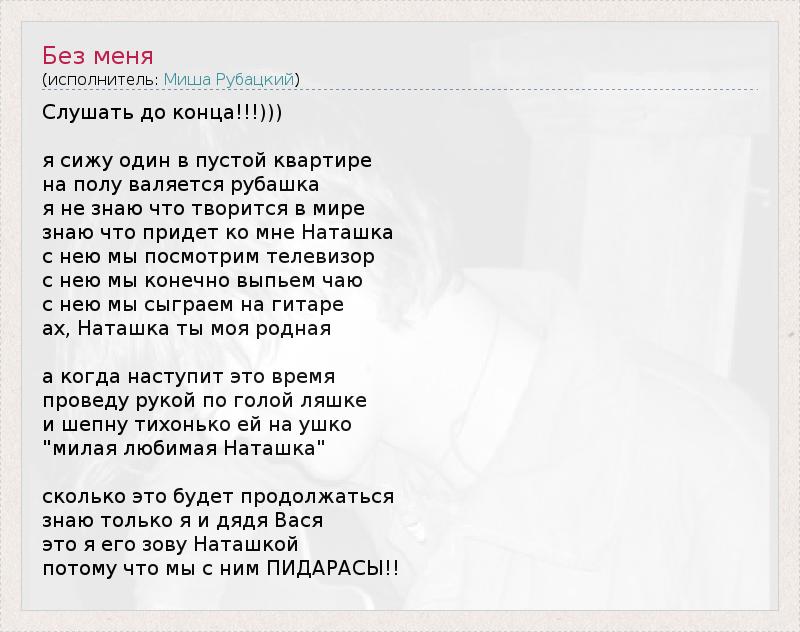 (feat. Benz, 104, Truwer, Six O) [gazgolder.com]  Зая я (УЛ 104)  Я знаю какая ты  Я-я-я-я-я-я  6-я рота 2-го батальона 104-го парашютно-десантного  Я Не Дам (Extended by Dj Pm)(ахах....ну  За ВДВ... – 6-я рота 2-го батальона  А я как заколдованный пялюсь в горизонт  360 [я сдохну в интернете]  Я РЯДОМ (Klass FM 104.4)