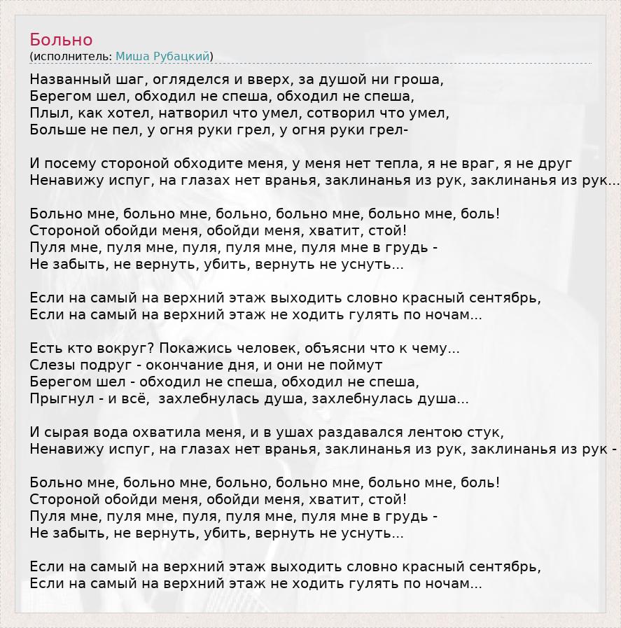 Названный шаг, огляделся и вверх, за душой ни гроша, Берегом шел, обходил не спеша, обходил не спеша, Плыл, как хотел, натворил что умел, сотворил что умел, Больше не пел, у огня руки грел, у огня руки грел- И посему стороной обходите меня, у меня нет тепла, я не враг, я не друг Ненавижу испуг, на глазах нет вранья, заклинанья из рук, заклинанья из рук... Больно мне, больно мне, больно, больно мне, больно мне, боль! Стороной обойди меня, обойди меня, хватит, стой! Пуля мне, пуля мне, пуля, пуля мне, пуля мне в грудь - Не забыть, не вернуть, убить, вернуть не уснуть... Если на самый на верхний этаж выходить словно красный сентябрь, Если на самый на верхний этаж не ходить гулять по ночам... Есть кто вокруг? Покажись человек, объясни что к чему... Слезы подруг - окончание дня, и они не поймут Берегом шел - обходил не спеша, обходил не спеша, Прыгнул - и всё, захлебнулась душа, захлебнулась душа... И сырая вода охватила меня, и в ушах раздавался лентою стук, Ненавижу испуг, на глазах нет вранья, заклинанья из рук, заклинанья из рук - Больно мне, больно мне, больно, больно мне, больно мне, боль! Стороной обойди меня, обойди меня, хватит, стой! Пуля мне, пуля мне, пуля, пуля мне, пуля мне в грудь - Не забыть, не вернуть, убить, вернуть не уснуть... Если на самый на верхний этаж выходить словно красный сентябрь, Если на самый на верхний этаж не ходить гулять по ночам...