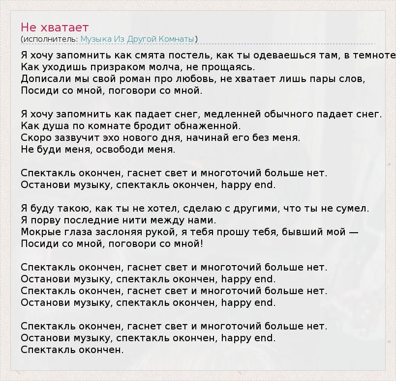 Я хочу запомнить как смята постель, как ты одеваешься там, в темноте Как уходишь призраком молча, не прощаясь. Дописали мы свой роман про любовь, не хватает лишь пары слов, Посиди со мной, поговори со мной. Я хочу запомнить как падает снег, медленней обычного падает снег. Как душа по комнате бродит обнаженной. Скоро зазвучит эхо нового дня, начинай его без меня. Не буди меня, освободи меня. Спектакль окончен, гаснет свет и многоточий больше нет. Останови музыку, спектакль окончен, happy end. Я буду такою, как ты не хотел, сделаю с другими, что ты не сумел. Я порву последние нити между нами. Мокрые глаза заслоняя рукой, я тебя прошу тебя, бывший мой — Посиди со мной, поговори со мной! Спектакль окончен, гаснет свет и многоточий больше нет. Останови музыку, спектакль окончен, happy end. Спектакль окончен, гаснет свет и многоточий больше нет. Останови музыку, спектакль окончен, happy end. Спектакль окончен, гаснет свет и многоточий больше нет. Останови музыку, спектакль окончен, happy end. Спектакль окончен.