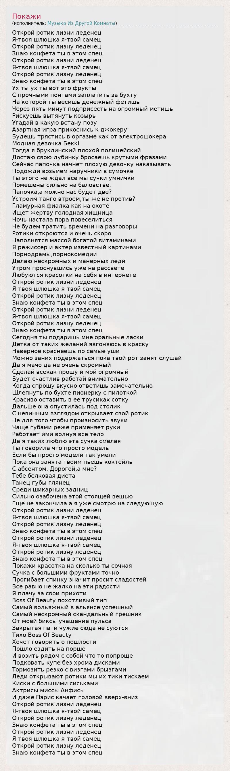 Открой ротик лизни леденец Я-твоя шлюшка я-твой самец Открой ротик лизну леденец Знаю конфета ты в этом спец Открой ротик лизни леденец Я-твоя шлюшка я-твой самец Открой ротик лизну леденец Знаю конфета ты в этом спец Ух ты ух ты вот это фрукты С прочными понтами заплатить за бухту На которой ты весишь денежный фетишь Через пять минут подприсесть на огромный метишь Рискуешь вытянуть козырь Угадай в какую встану позу Азартная игра прикоснись к джокеру Будешь трястись в оргазме как от электрошокера Модная девочка Беккi Тогда я бруклинский плохой полицейский Достаю свою дубинку бросаешь крутыми фразами Сейчас папочка начнет плохую девочку наказывать Подожди возьмем наручники в сумочке Ты этого не ждал все мы сучки умнички Помешены сильно на баловстве. Папочка,а можно нас будет две? Устроим танго втроем,ты же не против? Гламурная фиалка как на охоте Ищет жертву голодная хищница Ночь настала пора повеселиться Не будем тратить времени на разговоры Ротики откроются и очень скоро Наполнятся массой богатой витаминами Я режиссер и актер известный картинами Порнодрамы,порнокомедии Делаю нескромных и манерных леди Утром проснувшись уже на рассвете Любуются красотки на себя в интернете Открой ротик лизни леденец Я-твоя шлюшка я-твой самец Открой ротик лизну леденец Знаю конфета ты в этом спец Открой ротик лизни леденец Я-твоя шлюшка я-твой самец Открой ротик лизну леденец Знаю конфета ты в этом спец Сегодня ты подаришь мне оральные ласки Детка от таких желаний явгоняюсь в краску Наверное краснеешь по самые уши Можно заних подержаться пока твой рот занят слушай Да я мачо да не очень скромный Сделай всекак прошу и мой огромный Будет счастлив работай внимательно Когда спрошу вкусно ответишь замечательно Шлепнуть по бухте пионерку с пилоткой Красиво оставить в ее трусиках сотку Дальше она опустилась под столик С невинным взглядом открывает свой ротик Не для того чтобы произносить звуки Чаще губами реже применяет руки Работает ими волнуя все тело Да я таких люблю эта сучка смелая Ты говорила что просто модель Если бы просто модели так умели Пока она занята твоим пьешь коктейль С абсентом. Дорогой,а мне? Тебе белковая диета Танец губы глянец Среди шикарных задниц Сильно озабочена этой стоящей вещью Еще не закончила а я уже смотрю на следующую Открой ротик лизни леденец Я-твоя шлюшка я-твой самец Открой ротик лизну леденец Знаю конфета ты в этом спец Открой ротик лизни леденец Я-твоя шлюшка я-твой самец Открой ротик лизну леденец Знаю конфета ты в этом спец Покажи красотка на сколько ты сочная Сучка с большими фруктами точно Прогибает спинку значит просит сладостей Все равно не жалко на эти радости Я плачу за свои прихоти Boss Of Beauty похотливый тип Самый вольяжный в альянсе успешный Самый нескромный скандальный грешник От моей биксы учащение пульса Закрытая пати чужие сюда не суются Тихо Boss Of Beauty Хочет говорить о пошлости Пошло ездить на порше И возить рядом с собой что то попроще Подковать купе без хрома дисками Тормозить резко с визгами брызгами Леди открывают ротики мы их тики тискаем Киски с большими сиськами Актрисы миссы Анфисы И даже Пэрис качает головой вверх-вниз Открой ротик лизни леденец Я-твоя шлюшка я-твой самец Открой ротик лизну леденец Знаю конфета ты в этом спец Открой ротик лизни леденец Я-твоя шлюшка я-твой самец Откр