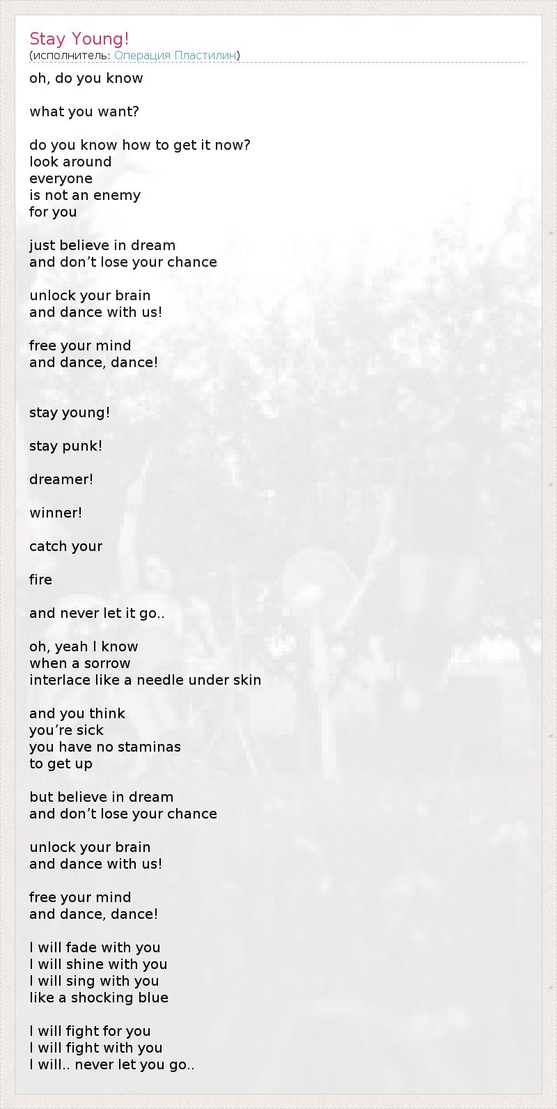 ой, вы знаете, что вы хотите? Вы знаете, как получить его сейчас? осмотреться каждый не враг для вас просто верить в мечту и не теряйте свой шанс разблокировать ваш мозг и танцевать вместе с нами! Free Your Mind и танцевать, танцевать! оставаться молодым! пребывание панк! мечтатель! победитель! поймать пожар и никогда не отпустить .. ой, да я знаю, когда печаль чересстрочной как иглы под кожу и вы думаете, Вы больны у вас нет staminas вставать но верить в мечту и не теряйте свой шанс разблокировать ваш мозг и танцевать вместе с нами! Free Your Mind и танцевать, танцевать! Я исчезнут с вами Я буду светить с вами Я буду петь с вами как Shocking Blue Я буду сражаться за вас Я буду бороться с вами Я буду .. Never Let You Go ..