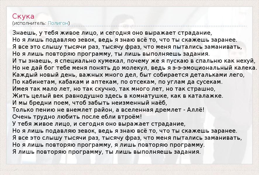Но я лишь подавляю зевок, ведь я знаю всё то, что ты скажешь заранее.