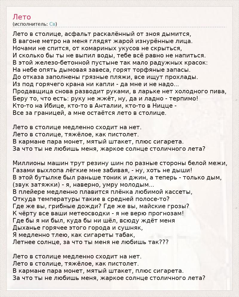 Лето в столице, асфальт раскалённый от зноя дымится, В вагоне метро на меня глядят жарой изнурённые лица. Ночами не спится, от комариных укусов не скрыться, И сколько бы ты не выпил воды, тебе всё равно не напиться. В этой железо-бетонной пустыне так мало радужных красок: На небе опять дымовая завеса, горят торфяные запасы. До отказа заполнены грязные пляжи, все ищут прохлады. Из под горячего крана ни капли - да мне и не надо... Продавщица снова разводит руками, в ларьке нет холодного пива, Беру то, что есть: руку не жжёт, ну, да и ладно - терпимо! Кто-то на Ибице, кто-то в Анталии, кто-то в Ницце - Все за границей, а мне остаётся лето в столице. Лето в столице медленно сходит на нет. Лето в столице, тяжёлое, как пистолет. В кармане пара монет, мятый штакет, плюс сигарета. За что ты не любишь меня, жаркое солнце столичного лета? Миллионы машин трут резину шин по разные стороны белой межи, Газами выхлопа лёгкие мне забивая, - ну, хоть не дыши! В этой бутылке был раньше тоник и джин, а теперь - только дым, (звук затяжки) - я, наверно, умру молодым... В плейере медленно плавится плёнка любимой кассеты, Откуда температуры такие в средней полосе-то? Где же вы, грибные дожди? Где же вы, майские грозы? К чёрту все ваши метеосводки - я не верю прогнозам! Где бы я ни был, куда бы ни шёл, всюду ждёт меня Дыханье горячее этого города и сушняк, Я медленно тлею, как сигареты табак, Летнее солнце, за что ты меня не любишь так??? Лето в столице медленно сходит на нет. Лето в столице, тяжёлое, как пистолет. В кармане пара монет, мятый штакет, плюс сигарета. За что ты не любишь меня, жаркое солнце столичного лета?