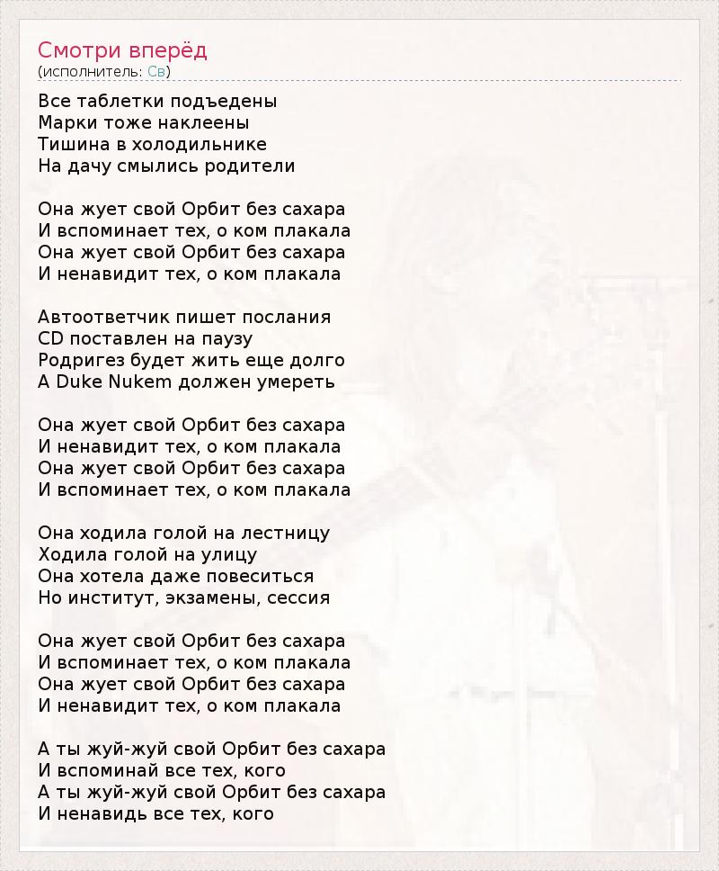 Все таблетки подъедены Марки тоже наклеены Тишина в холодильнике На дачу смылись родители Она жует свой Орбит без сахара И вспоминает тех, о ком плакала Она жует свой Орбит без сахара И ненавидит тех, о ком плакала Автоответчик пишет послания CD поставлен на паузу Родригез будет жить еще долго А Duke Nukem должен умереть Она жует свой Орбит без сахара И ненавидит тех, о ком плакала Она жует свой Орбит без сахара И вспоминает тех, о ком плакала Она ходила голой на лестницу Ходила голой на улицу Она хотела даже повеситься Но институт, экзамены, сессия Она жует свой Орбит без сахара И вспоминает тех, о ком плакала Она жует свой Орбит без сахара И ненавидит тех, о ком плакала А ты жуй-жуй свой Орбит без сахара И вспоминай все тех, кого А ты жуй-жуй свой Орбит без сахара И ненавидь все тех, кого