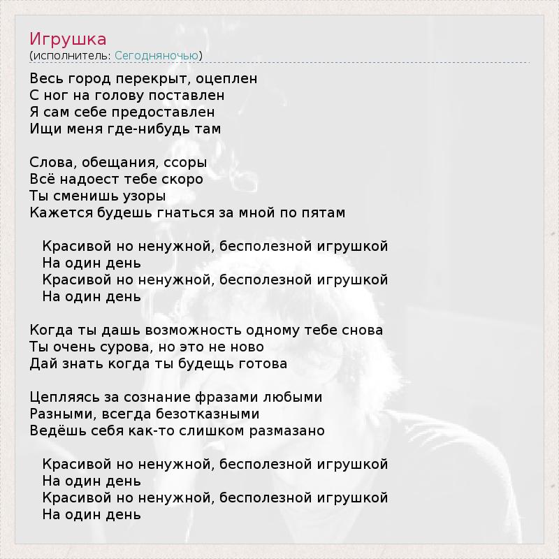 Весь город перекрыт, оцеплен С ног на голову поставлен Я сам себе предоставлен Ищи меня где-нибудь там Слова, обещания, ссоры Всё надоест тебе скоро Ты сменишь узоры Кажется будешь гнаться за мной по пятам Красивой но ненужной, бесполезной игрушкой На один день Красивой но ненужной, бесполезной игрушкой На один день Когда ты дашь возможность одному тебе снова Ты очень сурова, но это не ново Дай знать когда ты будещь готова Цепляясь за сознание фразами любыми Разными, всегда безотказными Ведёшь себя как-то слишком размазано Красивой но ненужной, бесполезной игрушкой На один день Красивой но ненужной, бесполезной игрушкой На один день