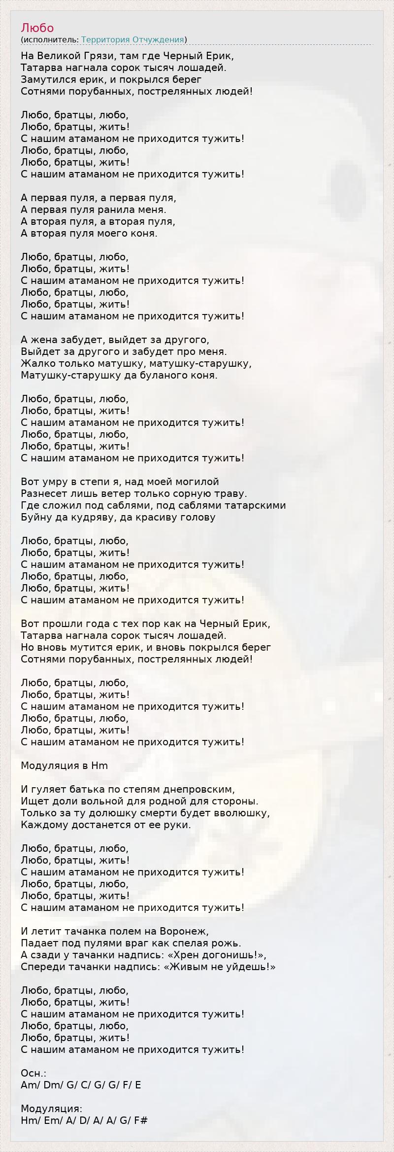 На Великой Грязи, там где Черный Ерик, Татарва нагнала сорок тысяч лошадей. Замутился ерик, и покрылся берег Сотнями порубанных, пострелянных людей! Любо, братцы, любо, Любо, братцы, жить! С нашим атаманом не приходится тужить! Любо, братцы, любо, Любо, братцы, жить! С нашим атаманом не приходится тужить! А первая пуля, а первая пуля, А первая пуля ранила меня. А вторая пуля, а вторая пуля, А вторая пуля моего коня. Любо, братцы, любо, Любо, братцы, жить! С нашим атаманом не приходится тужить! Любо, братцы, любо, Любо, братцы, жить! С нашим атаманом не приходится тужить! А жена забудет, выйдет за другого, Выйдет за другого и забудет про меня. Жалко только матушку, матушку-старушку, Матушку-старушку да буланого коня. Любо, братцы, любо, Любо, братцы, жить! С нашим атаманом не приходится тужить! Любо, братцы, любо, Любо, братцы, жить! С нашим атаманом не приходится тужить! Вот умру в степи я, над моей могилой Разнесет лишь ветер только сорную траву. Где сложил под саблями, под саблями татарскими Буйну да кудряву, да красиву голову Любо, братцы, любо, Любо, братцы, жить! С нашим атаманом не приходится тужить! Любо, братцы, любо, Любо, братцы, жить! С нашим атаманом не приходится тужить! Вот прошли года с тех пор как на Черный Ерик, Татарва нагнала сорок тысяч лошадей. Но вновь мутится ерик, и вновь покрылся берег Сотнями порубанных, пострелянных людей! Любо, братцы, любо, Любо, братцы, жить! С нашим атаманом не приходится тужить! Любо, братцы, любо, Любо, братцы, жить! С нашим атаманом не приходится тужить! Модуляция в Hm И гуляет батька по степям днепровским, Ищет доли вольной для родной для стороны. Только за ту долюшку смерти будет вволюшку, Каждому достанется от ее руки. Любо, братцы, любо, Любо, братцы, жить! С нашим атаманом не приходится тужить! Любо, братцы, любо, Любо, братцы, жить! С нашим атаманом не приходится тужить! И летит тачанка полем на Воронеж, Падает под пулями враг как спелая рожь. А сзади у тачанки надпись: «Хрен догонишь!», Спереди тачанки надпись: «Живым не уйдешь!» Любо, братцы, любо, Любо, братцы, жить! С нашим атаманом не приходится тужить! Любо, братцы, любо, Любо, братцы, жить! С нашим атаманом не приходится тужить! Осн.: Am/ Dm/ G/ C/ G/ G/ F/ E Модуляция: Hm/ Em/ A/ D/ A/ A/ G/ F#