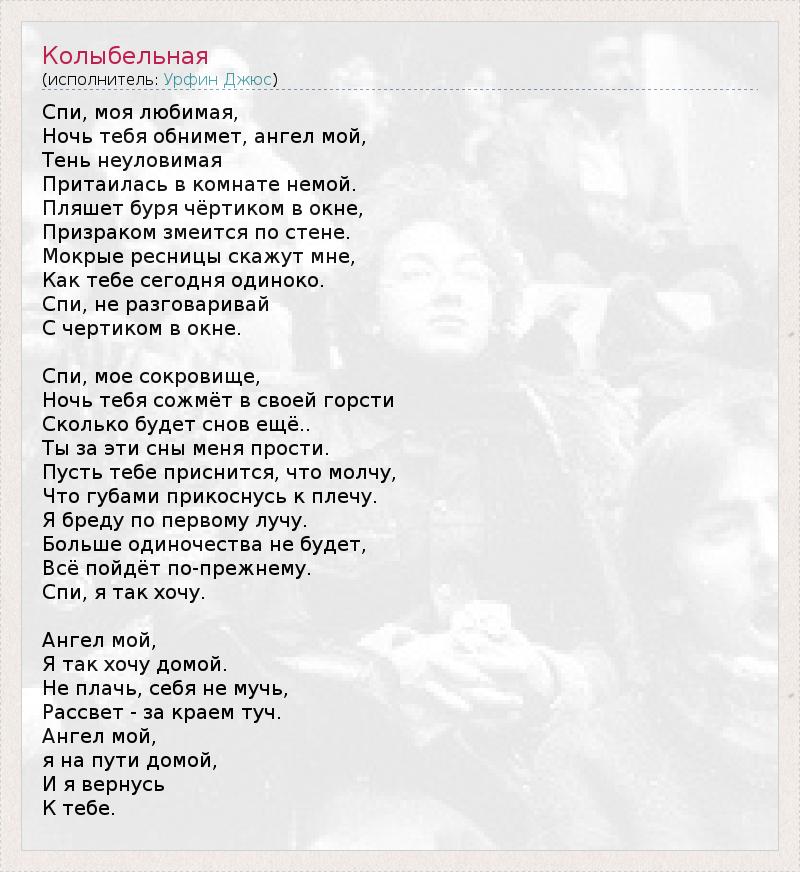 Спи, моя любимая, Ночь тебя обнимет, ангел мой, Тень неуловимая Притаилась в комнате немой. Пляшет буря чёртиком в окне, Призраком змеится по стене. Мокрые ресницы скажут мне, Как тебе сегодня одиноко. Спи, не разговаривай С чертиком в окне. Спи, мое сокровище, Ночь тебя сожмёт в своей горсти Сколько будет снов ещё.. Ты за эти сны меня прости. Пусть тебе приснится, что молчу, Что губами прикоснусь к плечу. Я бреду по первому лучу. Больше одиночества не будет, Всё пойдёт по-прежнему. Спи, я так хочу. Ангел мой, Я так хочу домой. Не плачь, себя не мучь, Рассвет - за краем туч. Ангел мой, я на пути домой, И я вернусь К тебе.