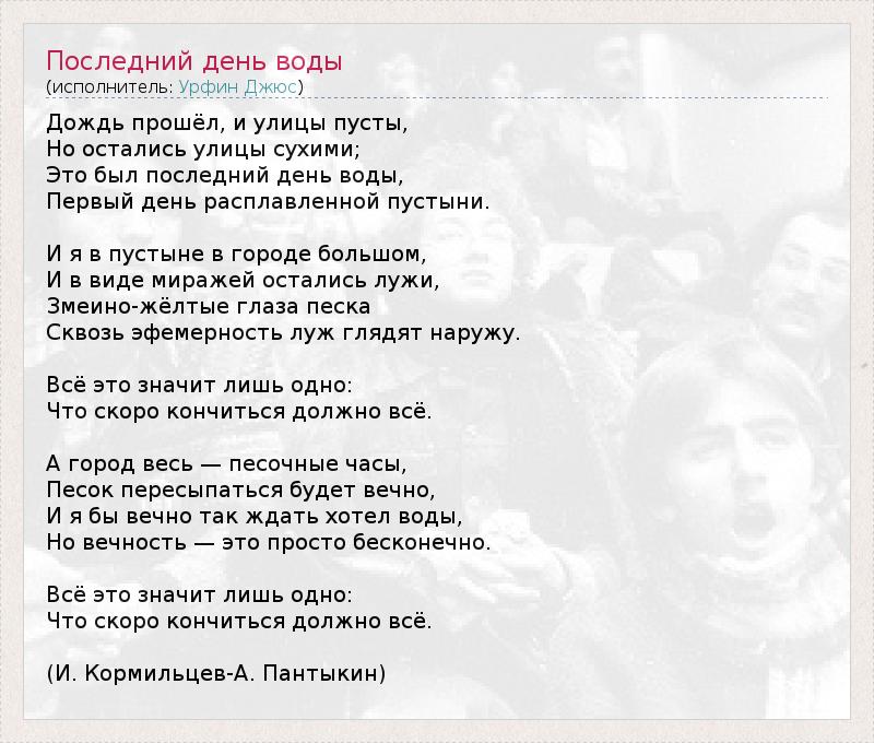 Дождь прошёл, и улицы пусты, Но остались улицы сухими; Это был последний день воды, Первый день расплавленной пустыни. И я в пустыне в городе большом, И в виде миражей остались лужи, Змеино-жёлтые глаза песка Сквозь эфемерность луж глядят наружу. Всё это значит лишь одно: Что скоро кончиться должно всё. А город весь — песочные часы, Песок пересыпаться будет вечно, И я бы вечно так ждать хотел воды, Но вечность — это просто бесконечно. Всё это значит лишь одно: Что скоро кончиться должно всё. (И. Кормильцев-А. Пантыкин)