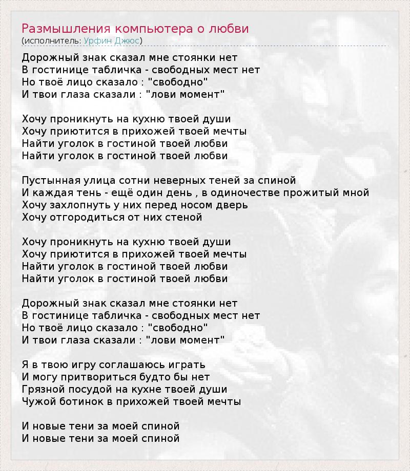 Дорожный знак сказал мне стоянки нет В гостинице табличка - свободных мест нет Но твоё лицо сказало : "свободно" И твои глаза сказали : "лови момент" Хочу проникнуть на кухню твоей души Хочу приютится в прихожей твоей мечты Найти уголок в гостиной твоей любви Найти уголок в гостиной твоей любви Пустынная улица сотни неверных теней за спиной И каждая тень - ещё один день , в одиночестве прожитый мной Хочу захлопнуть у них перед носом дверь Хочу отгородиться от них стеной Хочу проникнуть на кухню твоей души Хочу приютится в прихожей твоей мечты Найти уголок в гостиной твоей любви Найти уголок в гостиной твоей любви Дорожный знак сказал мне стоянки нет В гостинице табличка - свободных мест нет Но твоё лицо сказало : "свободно" И твои глаза сказали : "лови момент" Я в твою игру соглашаюсь играть И могу притвориться будто бы нет Грязной посудой на кухне твоей души Чужой ботинок в прихожей твоей мечты И новые тени за моей спиной И новые тени за моей спиной