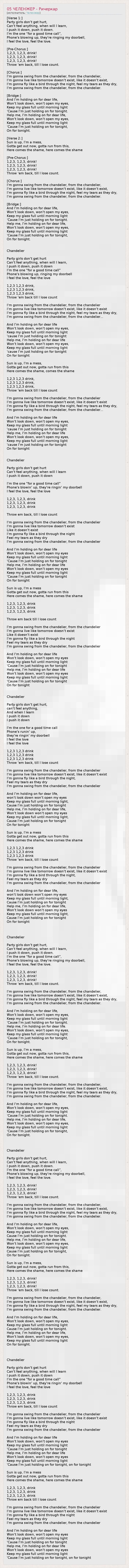 [Verse 1:] Party girls don't get hurt, Can't feel anything, when will I learn, I push it down, push it down. I'm the one “for a good time call”, Phone's blowing up, they're ringing my doorbell, I feel the love, feel the love. [Pre-Chorus:] 1,2,3, 1,2,3, drink! 1,2,3, 1,2,3, drink! 1,2,3, 1,2,3, drink! Throw ‘em back, till I lose count. [Chorus:] I'm gonna swing from the chandelier, from the chandelier, I'm gonna live like tomorrow doesn't exist, like it doesn't exist, I'm gonna fly like a bird through the night, feel my tears as they dry, I'm gonna swing from the chandelier, from the chandelier. [Bridge:] And I'm holding on for dear life, Won't look down, won't open my eyes, Keep my glass full until morning light ‘Cause I'm just holding on for tonight. Help me, I'm holding on for dear life, Won't look down, won't open my eyes, Keep my glass full until morning light ‘Cause I'm just holding on for tonight, On for tonight. [Verse 2:] Sun is up, I'm a mess, Gotta get out now, gotta run from this, Here comes the shame, here comes the shame [Pre-Chorus:] 1,2,3, 1,2,3, drink! 1,2,3, 1,2,3, drink! 1,2,3, 1,2,3, drink! Throw ‘em back, till I lose count. [Chorus:] I'm gonna swing from the chandelier, from the chandelier, I'm gonna live like tomorrow doesn't exist, like it doesn't exist, I'm gonna fly like a bird through the night, feel my tears as they dry, I'm gonna swing from the chandelier, from the chandelier. [Bridge:] And I'm holding on for dear life, Won't look down, won't open my eyes, Keep my glass full until morning light ‘Cause I'm just holding on for tonight. Help me, I'm holding on for dear life, Won't look down, won't open my eyes, Keep my glass full until morning light ‘Cause I'm just holding on for tonight, On for tonight. Chandelier Party girls don't get hurt Can't feel anything, when will I learn, I push it down, push it down I'm the one "for a good time call" Phone's blowing up, ringing my doorbell I feel the love, feel the love 1,2,3 1,2,3 drink, 1,2,3 1,2,3 drink, 1,2,3 1,2,3 drink, Throw 'em back till I lose count I'm gonna swing from the chandelier, from the chandelier I'm gonna live like tomorrow doesn't exist, like it doesn't exist I'm gonna fly like a bird through the night, feel my tears as they dry, I'm gonna swing from the chandelier, from the chandelier... And I'm holding on for dear life Won't look down, won't open my eyes, Keep my glass full until morning light 'cause I'm just holding on for tonight Help me, I'm holding on for dear life Won't look down, won't open my eyes, Keep my glass full until morning light 'cause I'm just holding on for tonight On for tonight Sun is up, I'm a mess, Gotta get out now, gotta run from this Here comes the shame, comes the shame 1,2,3 1,2,3 drink, 1,2,3 1,2,3 drink, 1,2,3 1,2,3 drink, Throw 'em back till I lose count I'm gonna swing from the chandelier, from the chandelier I'm gonna live like tomorrow doesn't exist, like it doesn't exist I'm gonna fly like a bird through the night, feel my tears as they dry, I'm gonna swing from the chandelier, from the chandelier... And I'm holding on for dear life Won't look down, won't open my eyes, Keep my glass full until morning light 'cause I'm just holding on for tonight Help me, I'm holding on for dear life Won't look down, won't open my eyes, Keep my glass full until morning light 'cause I'm just holding on for tonight On for tonight Chandelier Party girls don't get hurt Can't feel anything, when will I learn I push it down, push it down I'm the one "for a good time call" Phone's blowin' up, they're ringin' my doorbell I feel the love, feel the love 1,2,3, 1,2,3, drink 1,2,3, 1,2,3, drink 1,2,3, 1,2,3, drink Throw em back, till I lose count I'm gonna swing from the chandelier, from the chandelier I'm gonna live like tomorrow doesn't exist Like it doesn't exist I'm gonna fly like a bird through the night Feel my tears as they dry I'm gonna swing from the chandelier, from the chandelier And I'm holding on for dear life Won't look down, won't open my eyes Keep my glass full until morning light 'Cause I'm just holding on for tonight Help me, I'm holding on for dear life Won't look down, won't open my eyes Keep my glass full until morning light 'Cause I'm just holding on for tonight On for tonight Sun is up, I'm a mess Gotta get out now, gotta run from this Here comes the shame, here comes the shame 1,2,3, 1,2,3, drink 1,2,3, 1,2,3, drink 1,2,3, 1,2,3, drink Throw em back till I lose count I'm gonna swing from the chandelier, from the chandelier I'm gonna live like tomorrow doesn't exist Like it doesn't exist I'm gonna fly like a bird through the night Feel my tears as they dry I'm gonna swing from the chandelier, from the chandelier And I'm holding on for dear life Won't look down, won't open my eyes Keep my glass full until morning light 'Cause I'm just holding on for tonight Help me, I'm holding on for dear life Won't look down, won't open my eyes Keep my glass full until morning light 'Cause I'm just holding on for tonight On for tonight Chandelier Party girls don't get hurt, can't feel anything, And when I learn I push it down I push it down I'm the one for a good time call Phone's runin' up, they're ringin' my doorbell I feel the love I feel the love 1,2,3 1,2,3 drink 1,2,3 1,2,3 drink 1,2,3 1,2,3 drink Throw 'em back, till I lose count I'm gonna swing from the chandelier, from the chandelier I'm gonna live like tomorrow doesn't exist, like it doesn't exist I'm gonna fly like a bird through the night, Feel my tears as they dry I'm gonna swing from the chandelier, from the chandelier And I'm holding on for dear life, won't look down won't open my eyes Keep my glass full until morning light, Cause I'm just holding on for tonight Help me, I'm holding on for dear life, Won't look down won't open my eyes Keep my glass full until morning light, Cause I'm just holding on for tonight On for tonight Sun is up, I'm a mess Gotta get out now, gotta run from this Here comes the shame, 