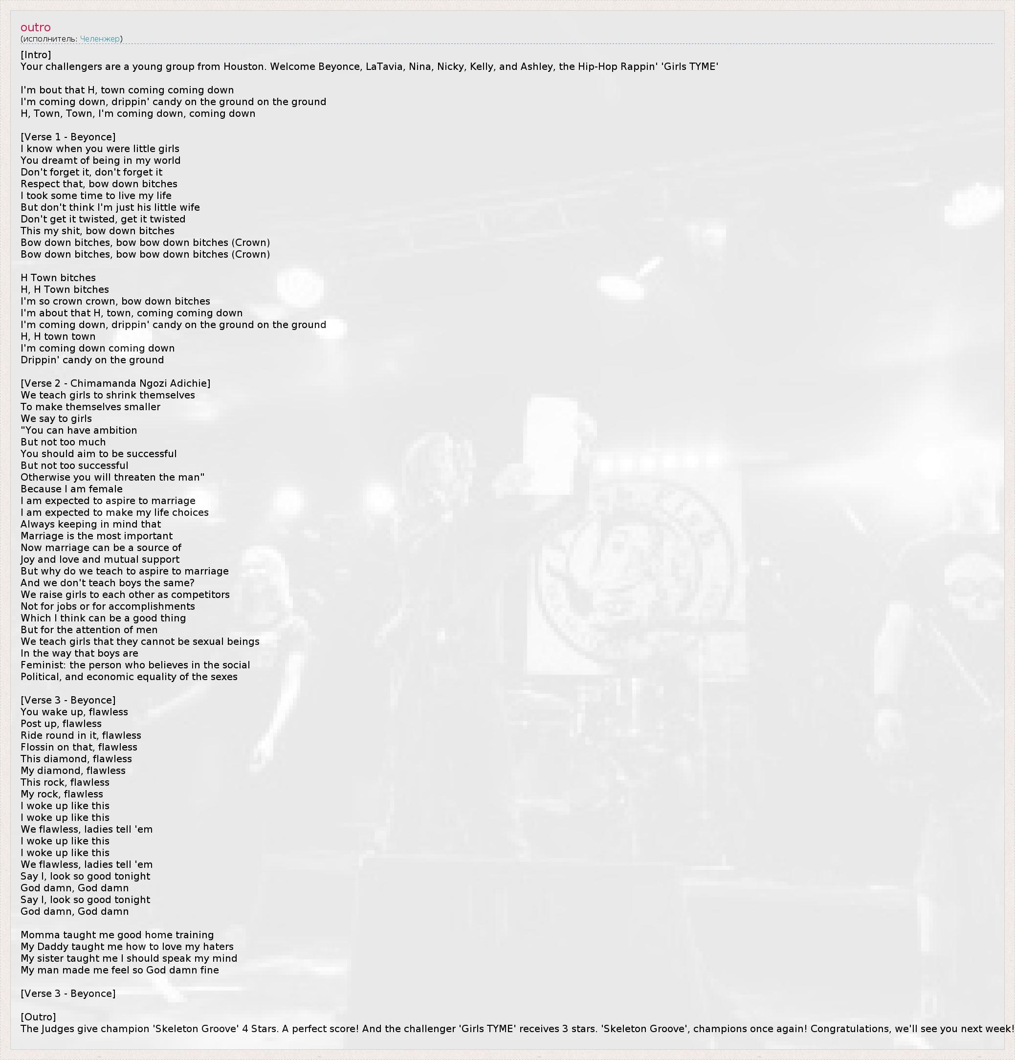 [Intro] Your challengers are a young group from Houston. Welcome Beyonce, LaTavia, Nina, Nicky, Kelly, and Ashley, the Hip-Hop Rappin' 'Girls TYME' I'm bout that H, town coming coming down I'm coming down, drippin' candy on the ground on the ground H, Town, Town, I'm coming down, coming down [Verse 1 - Beyonce] I know when you were little girls You dreamt of being in my world Don't forget it, don't forget it Respect that, bow down bitches I took some time to live my life But don't think I'm just his little wife Don't get it twisted, get it twisted This my shit, bow down bitches Bow down bitches, bow bow down bitches (Crown) Bow down bitches, bow bow down bitches (Crown) H Town bitches H, H Town bitches I'm so crown crown, bow down bitches I'm about that H, town, coming coming down I'm coming down, drippin' candy on the ground on the ground H, H town town I'm coming down coming down Drippin' candy on the ground [Verse 2 - Chimamanda Ngozi Adichie] We teach girls to shrink themselves To make themselves smaller We say to girls "You can have ambition But not too much You should aim to be successful But not too successful Otherwise you will threaten the man" Because I am female I am expected to aspire to marriage I am expected to make my life choices Always keeping in mind that Marriage is the most important Now marriage can be a source of Joy and love and mutual support But why do we teach to aspire to marriage And we don't teach boys the same? We raise girls to each other as competitors Not for jobs or for accomplishments Which I think can be a good thing But for the attention of men We teach girls that they cannot be sexual beings In the way that boys are Feminist: the person who believes in the social Political, and economic equality of the sexes [Verse 3 - Beyonce] You wake up, flawless Post up, flawless Ride round in it, flawless Flossin on that, flawless This diamond, flawless My diamond, flawless This rock, flawless My rock, flawless I woke up like this I woke up like this We flawless, ladies tell 'em I woke up like this I woke up like this We flawless, ladies tell 'em Say I, look so good tonight God damn, God damn Say I, look so good tonight God damn, God damn Momma taught me good home training My Daddy taught me how to love my haters My sister taught me I should speak my mind My man made me feel so God damn fine [Verse 3 - Beyonce] [Outro] The Judges give champion 'Skeleton Groove' 4 Stars. A perfect score! And the challenger 'Girls TYME' receives 3 stars. 'Skeleton Groove', champions once again! Congratulations, we'll see you next week!