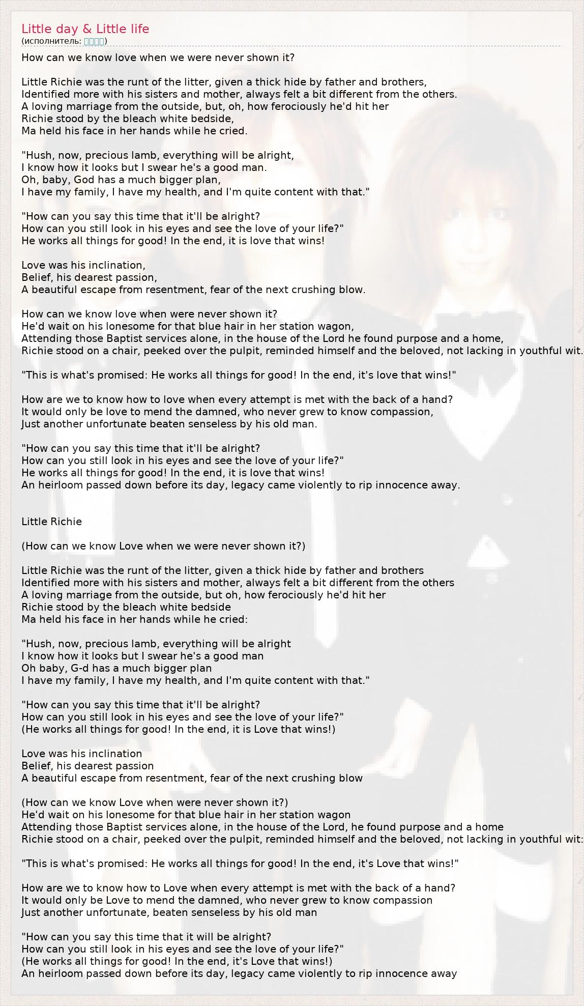 Как мы можем узнать любовь, если никогда не выказывали её? Малыш Ричи был самым мелким в помёте, отец и братья продубили ему шкуру, Он сильнее отождествлял себя с сестрами и матерью, всегда чувствовал себя немного другим. Счастливый брак со стороны, но, ох, как же свирепо он её лупил, Ричи стоит у белой прикроватной тумбочки, Мама закрывает ему лицо руками, пока он ревёт. "Тише, тише, ягнёночек, всё будет хорошо. Я понимаю, как это смотрится, но, клянусь, он хороший человек. Малыш, планы бога глубже, У меня есть семья, я здорова, я этим вполне довольна". "Как ты и в этот раз можешь говорить, что всё будет хорошо? Как ты можешь глядеть ему в глаза и видеть любовь всей своей жизни?" Он всё делает во благо! В конце концов, любовь победит! Любовь была его влечением, Убеждением, его ценнейшей страстью, Чудесным побегом от обиды, страха следующей трёпки. Как мы можем узнать любовь, если никогда не выказывали её? Он ждёт, когда останется один, чтобы полюбоваться синевлаской в её спортивном автомобиле, Один ходит на баптистские службы, в доме божьем он обрёл цель и приют, Ричи встал на стул, заглянул за кафедру, вспомнил себя, в голове у парнишки хватило места и для любимых: "Вот, что обещано. Он всё делает во благо! В конце концов, любовь победит!" Как мы должны узнать любовь, если каждая попытка натыкается на оплеуху? Только любовь исцелила бы проклятого, выросшего, чтобы не знать сочувствия, Ещё один бедолага, избитый до бесчувствия своим стариком. "Как ты и в этот раз можешь говорить, что всё будет хорошо? Как ты можешь глядеть ему в глаза и видеть любовь всей своей жизни?" "Он всё делает во благо! В конце концов, любовь победит!" Фамильные черты проявились раньше, наследие жестоко расправилось с невинностью. Маленький Ричи (перевод Ксения из Омска) (Откуда нам знать, что такое Любовь, если нам никогда ее не показывали?) Маленький Ричи был младшим в семье, его гоняли отец и братья. Он больше тянулся к сестрам и матери, всегда чувствовал себя не таким, как все. С виду вроде счастливый брак, но боже, как жестоко он ее ударил! Ричи стоял у кровати с пахнущими хлоркой белыми простынями, Ма держала лицо сына в своих ладонях, пока он плакал. "Тише, мой золотой, все будет хорошо. Я знаю, как это выглядит, но клянусь, он хороший человек. Эх, малыш, у Бога для всех свое предназначение. У меня есть семья, я здорова, и мне хватит". "Как ты можешь сейчас говорить, что все будет хорошо? Как ты можешь смотреть в его глаза и по-прежнему видеть любовь своей жизни?" (Бог все творит во благо! В конце концов, побеждает Любовь!) Он всегда искал любви, Верил в нее, превозносил выше всех благ. Для него это – красивое убежище от обид, от страха перед следующим поражением. (Откуда нам знать, что такое Любовь, если нам ее никогда не показывали?) Он будет ждать в одиночестве синих волос в ее фургоне. Сидя один на баптистской службе, в храме Божьем, он нашел себя и свой дом. Ричи стоял на стуле, выглядывал из-за кафедры и напоминал себе и ближним, не лишенным остроты юношеского ума: "Это абсолютно точно: Бог все творит во благо! В конце концов, побеждает Любовь!" Откуда нам знать, что такое Любовь, если любая попытка отвергается взмахом руки? Только Любовь поможет отверженному, который никогда не знал сострадания. Просто еще один несчастный, которого удары старика научили быть бесчувственным. "Как ты можешь сейчас гово