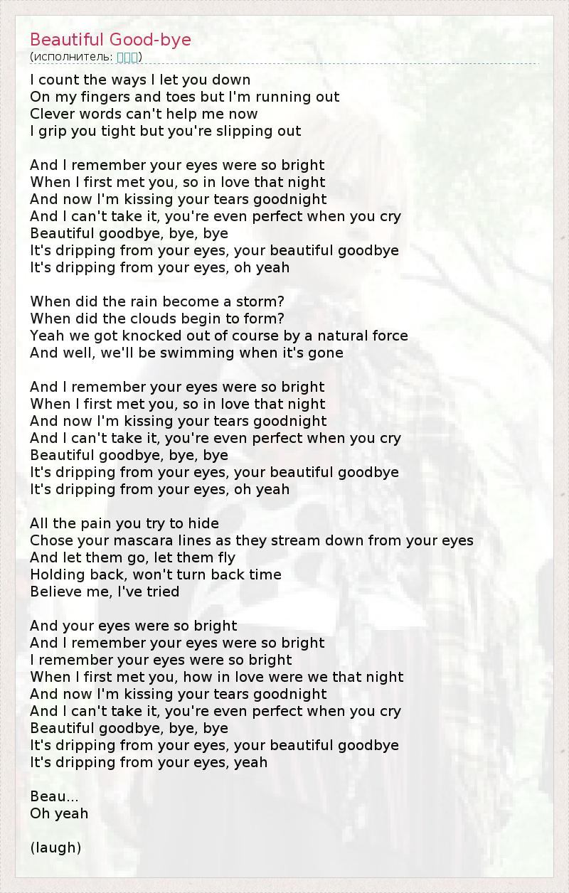 Я считаю, сколько раз я подвёл тебя На пальцах рук и ног, но их не хватает. Умные слова мне сейчас не помогут. Я крепко сжимаю тебя, но ты выскальзываешь. Я помню, как сверкали твои глаза, Когда я впервые встретил тебя, такие влюблённые той ночью. Теперь я целую твои слезы перед сном, И я не могу этого вынести, ты прекрасна, даже когда ты плачешь. Красивое прощание, прощай, прощай, Оно капает у тебя из глаз, твоё красивое прощание, Оно капает у тебя из глаз, о да. Когда дождь превратился в шторм? Когда тучи стали сгущаться? Да, нас выбили из колеи, естественно, силы природы, Ну что ж, тогда мы будем плавать, когда всё закончится. Я помню, как сверкали твои глаза, Когда я впервые встретил тебя, такие влюблённые той ночью. Теперь я целую твои слезы перед сном, И я не могу этого вынести, ты прекрасна, даже когда ты плачешь. Красивое прощание, прощай, прощай, Оно капает у тебя из глаз, твоё красивое прощание, Оно капает у тебя из глаз, о да. Всю ту боль, что ты пытаешься скрыть, Выдают подтёки туши, тянущиеся от твоих глаз. Отпусти их, пусть летят, Попытки удержать не повернут время вспять. Поверь мне, я пытался. Твои глаза так сверкали, Я помню, как сверкали твои глаза, Я помню, как сверкали твои глаза, Когда я впервые встретил тебя, какими влюблёнными мы были той ночью. Теперь я целую твои слезы перед сном, И я не могу этого вынести, ты прекрасна, даже когда ты плачешь. Красивое прощание, прощай, прощай, Оно капает у тебя из глаз, твоё красивое прощание, Оно капает у тебя из глаз, да. Краси... О, да. (смех)