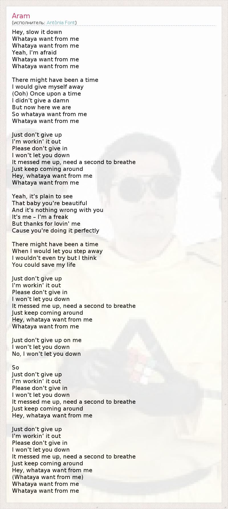 Hey, slow it down Whataya want from me Whataya want from me Yeah, I'm afraid Whataya want from me Whataya want from me There might have been a time I would give myself away (Ooh) Once upon a time I didn't give a damn But now here we are So whataya want from me Whataya want from me Just don't give up I'm workin' it out Please don't give in I won't let you down It messed me up, need a second to breathe Just keep coming around Hey, whataya want from me Whataya want from me Yeah, it's plain to see That baby you're beautiful And it's nothing wrong with you It's me – I'm a freak But thanks for lovin' me Cause you're doing it perfectly There might have been a time When I would let you step away I wouldn't even try but I think You could save my life Just don't give up I'm workin' it out Please don't give in I won't let you down It messed me up, need a second to breathe Just keep coming around Hey, whataya want from me Whataya want from me Just don't give up on me I won't let you down No, I won't let you down So Just don't give up I'm workin' it out Please don't give in I won't let you down It messed me up, need a second to breathe Just keep coming around Hey, whataya want from me Just don't give up I'm workin' it out Please don't give in I won't let you down It messed me up, need a second to breathe Just keep coming around Hey, whataya want from me (Whataya want from me) Whataya want from me Whataya want from me