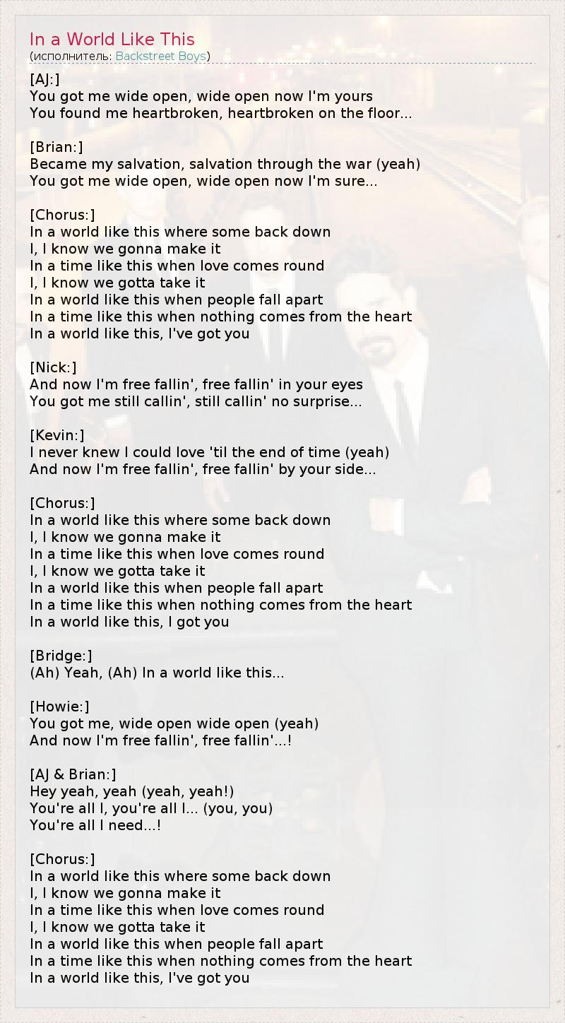 In a World Like This is the eighth (seventh in the United States) studio album from Backstreet Boys, one of the most successful boy bands of their generation. This follow-up to 2009's This Is Us once again features the full original line-up, with Kevin Richardson rejoining following his 2006 departure. In a World Like This is packed full of pop ballads and dancefloor fillers., Rovi