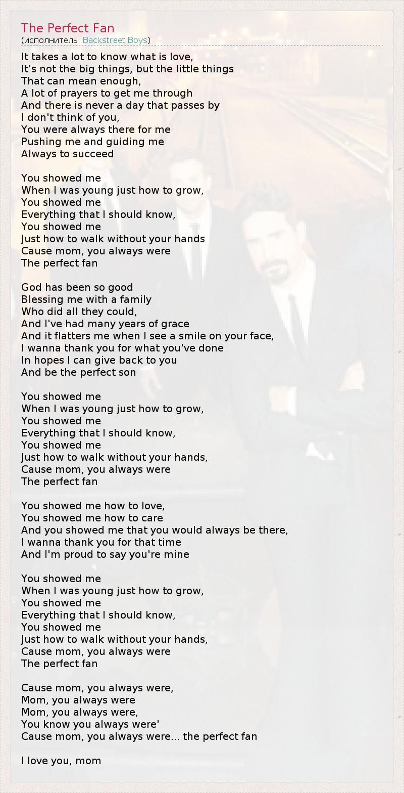 Нужно время, чтобы узнать, что такое любовь, Она не в большом, а в мелочах, Которые могут значить достаточно много, Огромное количество молитв помогают мне справиться, И не проходит ни одного дня, Чтобы я не думал о тебе, Ты всегда была рядом со мной, Подталкивая и ведя Меня всегда к успеху Ты показала мне, когда я был маленьким, Как расти, Ты показала мне все, Что я должен знать, Ты показала мне, Как быть самостоятельным, Потому что, мам, ты всегда была Идеальным фанатом Бог был так добр, Благословив меня такой семьей, Которая сделала все, что могла, И я прожил много лет Божьей благодати, И мне льстит, когда я вижу улыбку на твоем лице, Я хочу поблагодарить тебя за все, что ты сделала, В надежде,что я смогу отплатить тебе тем же И быть идеальным сыном Ты показала мне, когда я был маленьким, Как расти, Ты показала мне все, Что я должен знать, Ты показала мне, Как быть самостоятельным, Потому что, мам, ты всегда была Идеальным фанатом Ты показала мне, как любить, Ты показала мне, как заботиться, И ты показала мне, что ты всегда будешь рядом, Я хочу поблагодарить тебя за то время И я с гордостью говорю, что ты моя мама Ты показала мне, когда я был маленьким, Как расти, Ты показала мне все, Что я должен знать, Ты показала мне, Как быть самостоятельным, Потому что, мам, ты всегда была Идеальным фанатом Потому что, мам, ты всегда была Мам, ты всегда была Мам, ты всегда была Знаешь, ты всегда была Потому что, мам, ты всегда была... идеальным фанатом Я люблю тебя, мама