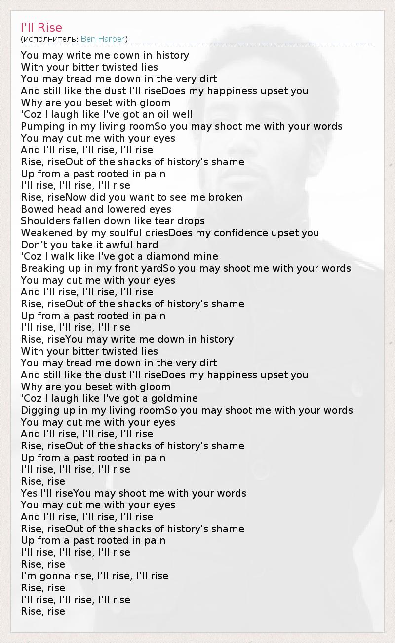 You may write me down in history With your bitter twisted lies You may tread me down in the very dirt And still like the dust I'll riseDoes my happiness upset you Why are you beset with gloom 'Coz I laugh like I've got an oil well Pumping in my living roomSo you may shoot me with your words You may cut me with your eyes And I'll rise, I'll rise, I'll rise Rise, riseOut of the shacks of history's shame Up from a past rooted in pain I'll rise, I'll rise, I'll rise Rise, riseNow did you want to see me broken Bowed head and lowered eyes Shoulders fallen down like tear drops Weakened by my soulful criesDoes my confidence upset you Don't you take it awful hard 'Coz I walk like I've got a diamond mine Breaking up in my front yardSo you may shoot me with your words You may cut me with your eyes And I'll rise, I'll rise, I'll rise Rise, riseOut of the shacks of history's shame Up from a past rooted in pain I'll rise, I'll rise, I'll rise Rise, riseYou may write me down in history With your bitter twisted lies You may tread me down in the very dirt And still like the dust I'll riseDoes my happiness upset you Why are you beset with gloom 'Coz I laugh like I've got a goldmine Digging up in my living roomSo you may shoot me with your words You may cut me with your eyes And I'll rise, I'll rise, I'll rise Rise, riseOut of the shacks of history's shame Up from a past rooted in pain I'll rise, I'll rise, I'll rise Rise, rise Yes I'll riseYou may shoot me with your words You may cut me with your eyes And I'll rise, I'll rise, I'll rise Rise, riseOut of the shacks of history's shame Up from a past rooted in pain I'll rise, I'll rise, I'll rise Rise, rise I'm gonna rise, I'll rise, I'll rise Rise, rise I'll rise, I'll rise, I'll rise Rise, rise