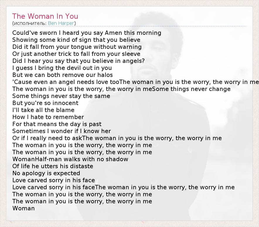 Could've sworn I heard you say Amen this morning Showing some kind of sign that you believe Did it fall from your tongue without warning Or just another trick to fall from your sleeve Did I hear you say that you believe in angels? I guess I bring the devil out in you But we can both remove our halos 'Cause even an angel needs love tooThe woman in you is the worry, the worry in me The woman in you is the worry, the worry in meSome things never change Some things never stay the same But you're so innocent I'll take all the blame How I hate to remember For that means the day is past Sometimes I wonder if I know her Or if I really need to askThe woman in you is the worry, the worry in me The woman in you is the worry, the worry in me The woman in you is the worry, the worry in me WomanHalf-man walks with no shadow Of life he utters his distaste No apology is expected Love carved sorry in his face Love carved sorry in his faceThe woman in you is the worry, the worry in me The woman in you is the worry, the worry in me The woman in you is the worry, the worry in me Woman