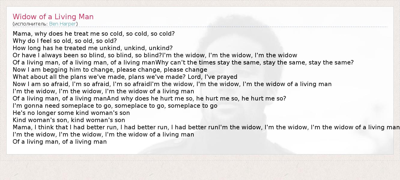 Mama, why does he treat me so cold, so cold, so cold? Why do I feel so old, so old, so old? How long has he treated me unkind, unkind, unkind? Or have I always been so blind, so blind, so blind?I'm the widow, I'm the widow, I'm the widow Of a living man, of a living man, of a living manWhy can't the times stay the same, stay the same, stay the same? Now I am begging him to change, please change, please change What about all the plans we've made, plans we've made? Lord, I've prayed Now I am so afraid, I'm so afraid, I'm so afraidI'm the widow, I'm the widow, I'm the widow of a living man I'm the widow, I'm the widow, I'm the widow of a living man Of a living man, of a living manAnd why does he hurt me so, he hurt me so, he hurt me so? I'm gonna need someplace to go, someplace to go, someplace to go He's no longer some kind woman's son Kind woman's son, kind woman's son Mama, I think that I had better run, I had better run, I had better runI'm the widow, I'm the widow, I'm the widow of a living man I'm the widow, I'm the widow, I'm the widow of a living man Of a living man, of a living man