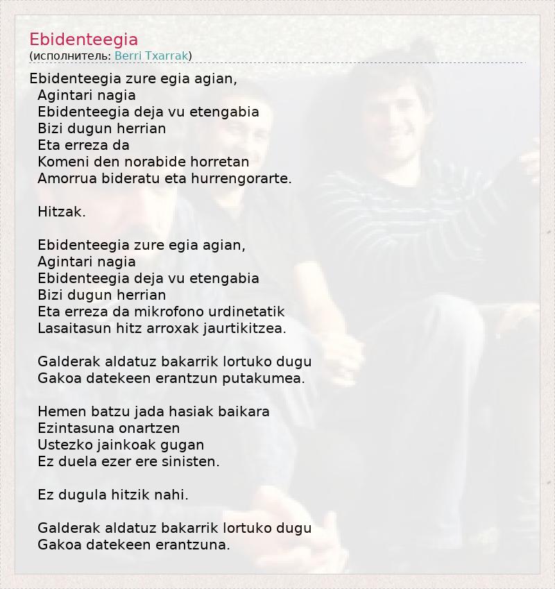 Ebidenteegia zure egia agian, Agintari nagia Ebidenteegia deja vu etengabia Bizi dugun herrian Eta erreza da Komeni den norabide horretan Amorrua bideratu eta hurrengorarte. Hitzak. Ebidenteegia zure egia agian, Agintari nagia Ebidenteegia deja vu etengabia Bizi dugun herrian Eta erreza da mikrofono urdinetatik Lasaitasun hitz arroxak jaurtikitzea. Galderak aldatuz bakarrik lortuko dugu Gakoa datekeen erantzun putakumea. Hemen batzu jada hasiak baikara Ezintasuna onartzen Ustezko jainkoak gugan Ez duela ezer ere sinisten. Ez dugula hitzik nahi. Galderak aldatuz bakarrik lortuko dugu Gakoa datekeen erantzuna.