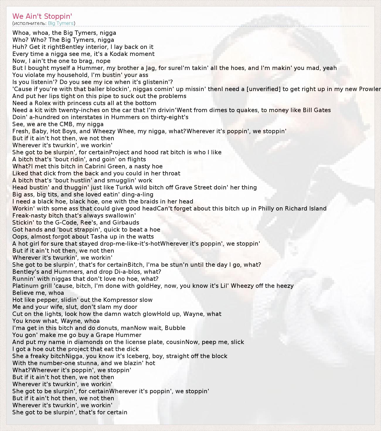Whoa, whoa, the Big Tymers, nigga Who? Who? The Big Tymers, nigga Huh? Get it rightBentley interior, I lay back on it Every time a nigga see me, it's a Kodak moment Now, I ain't the one to brag, nope But I bought myself a Hummer, my brother a Jag, for sureI'm takin' all the hoes, and I'm makin' you mad, yeah You violate my household, I'm bustin' your ass Is you listenin'? Do you see my ice when it's glistenin'? 'Cause if you're with that baller blockin', niggas comin' up missin' thenI need a [unverified] to get right up in my new Prowler And put her lips tight on this pipe to suck out the problems Need a Rolex with princess cuts all at the bottom Need a kit with twenty-inches on the car that I'm drivin'Went from dimes to quakes, to money like Bill Gates Doin' a-hundred on interstates in Hummers on thirty-eight's See, we are the CMB, my nigga Fresh, Baby, Hot Boys, and Wheezy Whee, my nigga, what?Wherever it's poppin', we stoppin' But if it ain't hot then, we not then Wherever it's twurkin', we workin' She got to be slurpin', for certainProject and hood rat bitch is who I like A bitch that's 'bout ridin', and goin' on flights What?I met this bitch in Cabrini Green, a nasty hoe Liked that dick from the back and you could in her throat A bitch that's 'bout hustlin' and smugglin' work Head bustin' and thuggin' just like TurkA wild bitch off Grave Street doin' her thing Big ass, big tits, and she loved eatin' ding-a-ling I need a black hoe, black hoe, one with the braids in her head Workin' with some ass that could give good headCan't forget about this bitch up in Philly on Richard Island Freak-nasty bitch that's always swallowin' Stickin' to the G-Code, Ree's, and Girbauds Got hands and 'bout strappin', quick to beat a hoe Oops, almost forgot about Tasha up in the watts A hot girl for sure that stayed drop-me-like-it's-hotWherever it's poppin', we stoppin' But if it ain't hot then, we not then Wherever it's twurkin', we workin' She got to be slurpin', that's for certainBitch, I'ma be stun'n until the day I go, what? Bentley's and Hummers, and drop Di-a-blos, what? Runnin' with niggas that don't love no hoe, what? Platinum grill 'cause, bitch, I'm done with goldHey, now, you know it's Lil' Wheezy off the heezy Believe me, whoa Hot like pepper, slidin' out the Kompressor slow Me and your wife, slut, don't slam my door Cut on the lights, look how the damn watch glowHold up, Wayne, what You know what, Wayne, whoa I'ma get in this bitch and do donuts, manNow wait, Bubble You gon' make me go buy a Grape Hummer And put my name in diamonds on the license plate, cousinNow, peep me, slick I got a hoe out the project that eat the dick She a freaky bitchNigga, you know it's Iceberg, boy, straight off the block With the number-one stunna, and we blazin' hot What?Wherever it's poppin', we stoppin' But if it ain't hot then, we not then Wherever it's twurkin', we workin' She got to be slurpin', for certainWherever it's poppin', we stoppin' But if it ain't hot then, we not then Wherever it's twurkin', we workin' She got to be slurpin', that's for certain