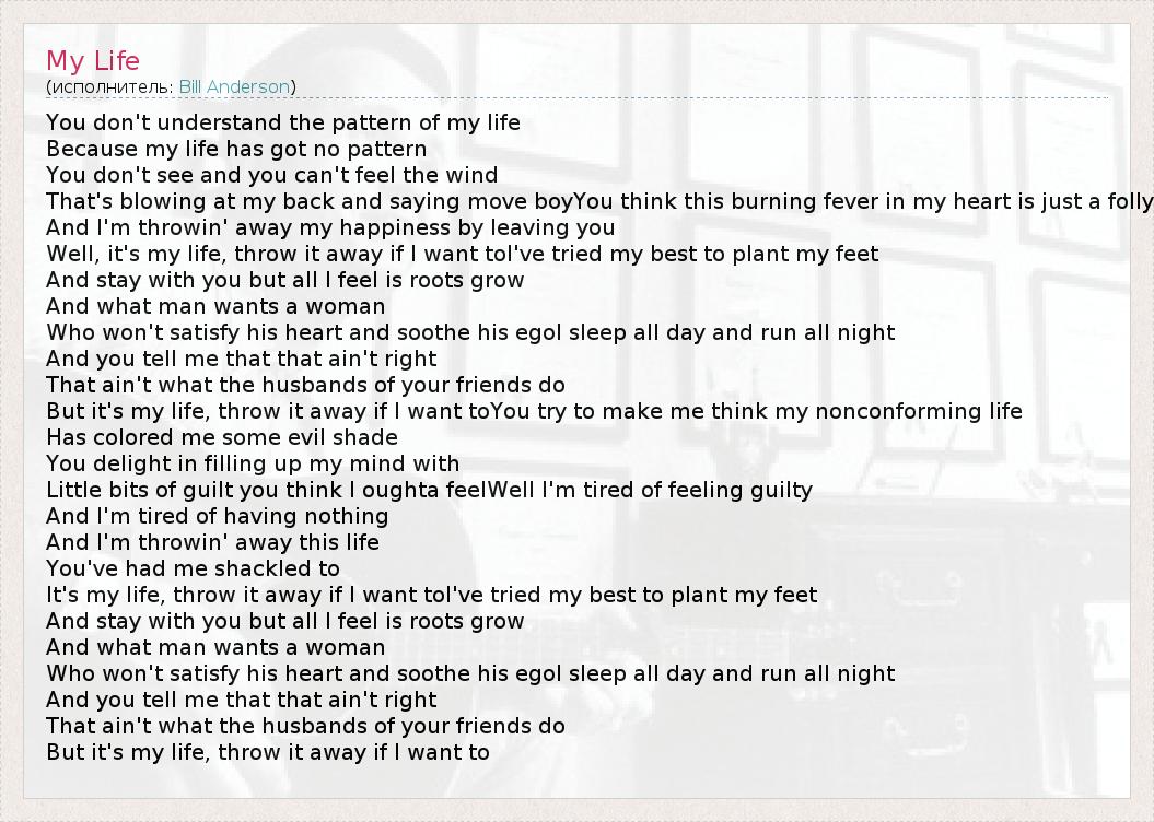 You don't understand the pattern of my life Because my life has got no pattern You don't see and you can't feel the wind That's blowing at my back and saying move boyYou think this burning fever in my heart is just a folly And I'm throwin' away my happiness by leaving you Well, it's my life, throw it away if I want toI've tried my best to plant my feet And stay with you but all I feel is roots grow And what man wants a woman Who won't satisfy his heart and soothe his egoI sleep all day and run all night And you tell me that that ain't right That ain't what the husbands of your friends do But it's my life, throw it away if I want toYou try to make me think my nonconforming life Has colored me some evil shade You delight in filling up my mind with Little bits of guilt you think I oughta feelWell I'm tired of feeling guilty And I'm tired of having nothing And I'm throwin' away this life You've had me shackled to It's my life, throw it away if I want toI've tried my best to plant my feet And stay with you but all I feel is roots grow And what man wants a woman Who won't satisfy his heart and soothe his egoI sleep all day and run all night And you tell me that that ain't right That ain't what the husbands of your friends do But it's my life, throw it away if I want to