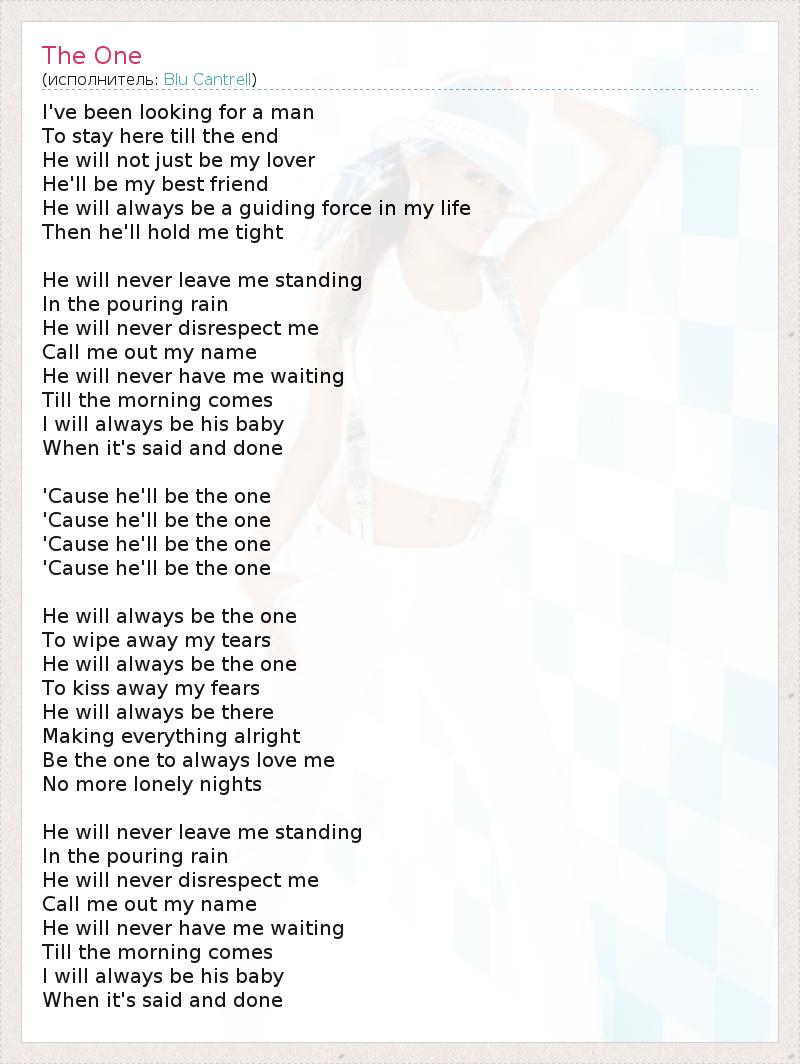 I've been looking for a man To stay here till the end He will not just be my lover He'll be my best friend He will always be a guiding force in my life Then he'll hold me tight He will never leave me standing In the pouring rain He will never disrespect me Call me out my name He will never have me waiting Till the morning comes I will always be his baby When it's said and done 'Cause he'll be the one 'Cause he'll be the one 'Cause he'll be the one 'Cause he'll be the one He will always be the one To wipe away my tears He will always be the one To kiss away my fears He will always be there Making everything alright Be the one to always love me No more lonely nights He will never leave me standing In the pouring rain He will never disrespect me Call me out my name He will never have me waiting Till the morning comes I will always be his baby When it's said and done