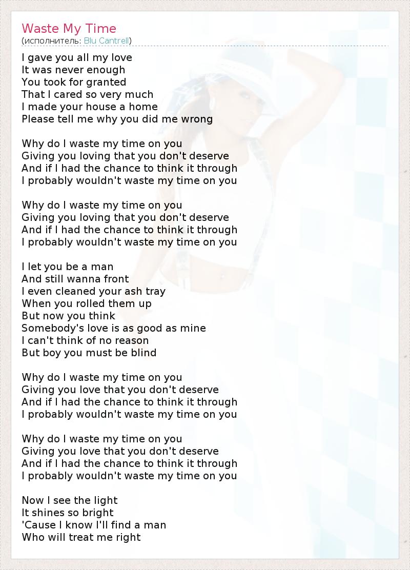 I gave you all my love It was never enough You took for granted That I cared so very much I made your house a home Please tell me why you did me wrong Why do I waste my time on you Giving you loving that you don't deserve And if I had the chance to think it through I probably wouldn't waste my time on you Why do I waste my time on you Giving you loving that you don't deserve And if I had the chance to think it through I probably wouldn't waste my time on you I let you be a man And still wanna front I even cleaned your ash tray When you rolled them up But now you think Somebody's love is as good as mine I can't think of no reason But boy you must be blind Why do I waste my time on you Giving you love that you don't deserve And if I had the chance to think it through I probably wouldn't waste my time on you Why do I waste my time on you Giving you love that you don't deserve And if I had the chance to think it through I probably wouldn't waste my time on you Now I see the light It shines so bright 'Cause I know I'll find a man Who will treat me right