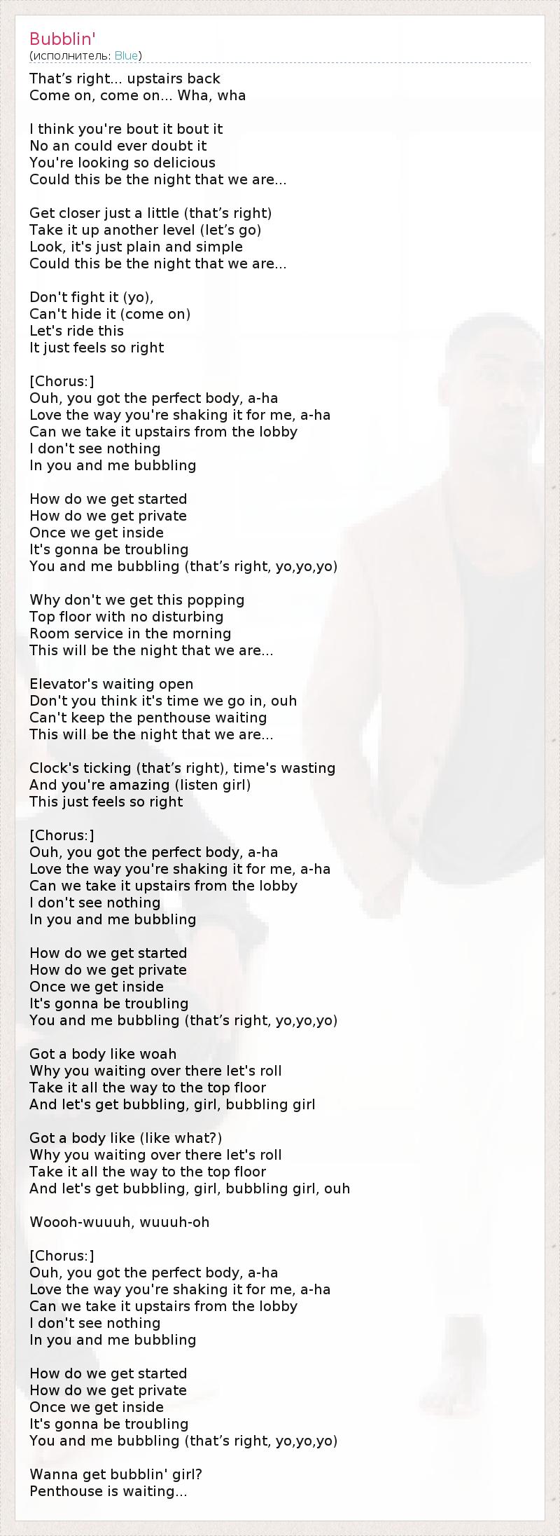 That’s right... upstairs back Come on, come on... Wha, wha I think you're bout it bout it No an could ever doubt it You're looking so delicious Could this be the night that we are... Get closer just a little (that’s right) Take it up another level (let’s go) Look, it's just plain and simple Could this be the night that we are... Don't fight it (yo), Can't hide it (come on) Let's ride this It just feels so right [Chorus:] Ouh, you got the perfect body, a-ha Love the way you're shaking it for me, a-ha Can we take it upstairs from the lobby I don't see nothing In you and me bubbling How do we get started How do we get private Once we get inside It's gonna be troubling You and me bubbling (that’s right, yo,yo,yo) Why don't we get this popping Top floor with no disturbing Room service in the morning This will be the night that we are... Elevator's waiting open Don't you think it's time we go in, ouh Can't keep the penthouse waiting This will be the night that we are... Clock's ticking (that’s right), time's wasting And you're amazing (listen girl) This just feels so right [Chorus:] Ouh, you got the perfect body, a-ha Love the way you're shaking it for me, a-ha Can we take it upstairs from the lobby I don't see nothing In you and me bubbling How do we get started How do we get private Once we get inside It's gonna be troubling You and me bubbling (that’s right, yo,yo,yo) Got a body like woah Why you waiting over there let's roll Take it all the way to the top floor And let's get bubbling, girl, bubbling girl Got a body like (like what?) Why you waiting over there let's roll Take it all the way to the top floor And let's get bubbling, girl, bubbling girl, ouh Woooh-wuuuh, wuuuh-oh [Chorus:] Ouh, you got the perfect body, a-ha Love the way you're shaking it for me, a-ha Can we take it upstairs from the lobby I don't see nothing In you and me bubbling How do we get started How do we get private Once we get inside It's gonna be troubling You and me bubbling (that’s right, yo,yo,yo) Wanna get bubblin' girl? Penthouse is waiting...