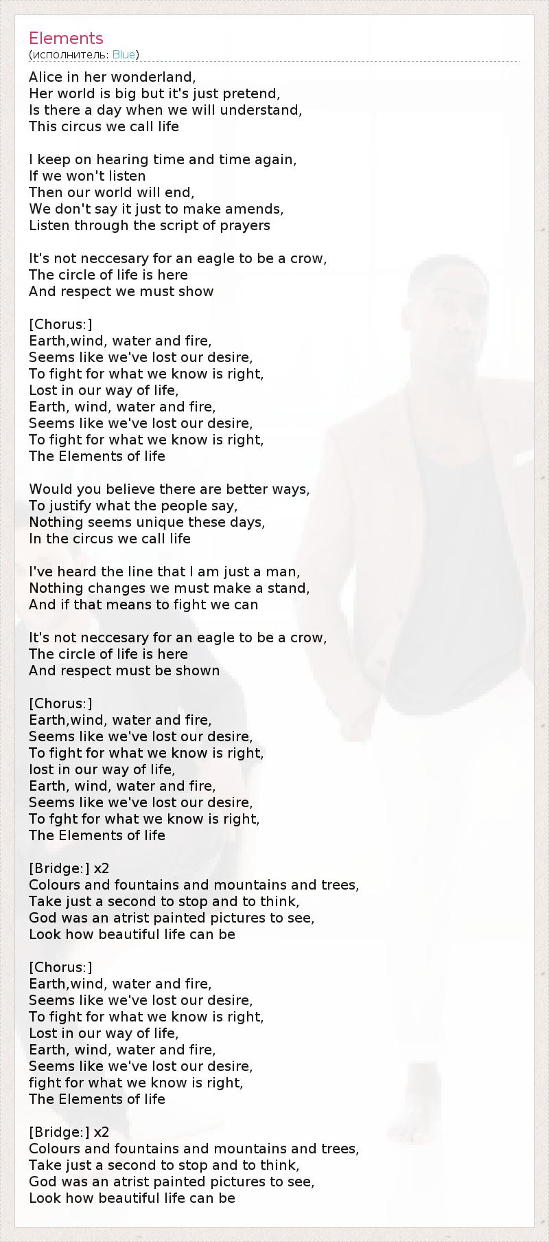 Alice in her wonderland, Her world is big but it's just pretend, Is there a day when we will understand, This circus we call life I keep on hearing time and time again, If we won't listen Then our world will end, We don't say it just to make amends, Listen through the script of prayers It's not neccesary for an eagle to be a crow, The circle of life is here And respect we must show [Chorus:] Earth,wind, water and fire, Seems like we've lost our desire, To fight for what we know is right, Lost in our way of life, Earth, wind, water and fire, Seems like we've lost our desire, To fight for what we know is right, The Elements of life Would you believe there are better ways, To justify what the people say, Nothing seems unique these days, In the circus we call life I've heard the line that I am just a man, Nothing changes we must make a stand, And if that means to fight we can It's not neccesary for an eagle to be a crow, The circle of life is here And respect must be shown [Chorus:] Earth,wind, water and fire, Seems like we've lost our desire, To fight for what we know is right, lost in our way of life, Earth, wind, water and fire, Seems like we've lost our desire, To fght for what we know is right, The Elements of life [Bridge:] x2 Colours and fountains and mountains and trees, Take just a second to stop and to think, God was an atrist painted pictures to see, Look how beautiful life can be [Chorus:] Earth,wind, water and fire, Seems like we've lost our desire, To fight for what we know is right, Lost in our way of life, Earth, wind, water and fire, Seems like we've lost our desire, fight for what we know is right, The Elements of life [Bridge:] x2 Colours and fountains and mountains and trees, Take just a second to stop and to think, God was an atrist painted pictures to see, Look how beautiful life can be