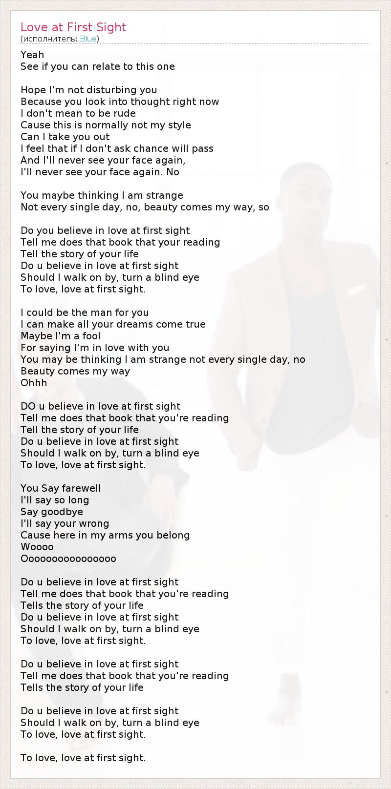 Yeah See if you can relate to this one Hope I'm not disturbing you Because you look into thought right now I don't mean to be rude Cause this is normally not my style Can I take you out I feel that if I don't ask chance will pass And I'll never see your face again, I'll never see your face again. No You maybe thinking I am strange Not every single day, no, beauty comes my way, so Do you believe in love at first sight Tell me does that book that your reading Tell the story of your life Do u believe in love at first sight Should I walk on by, turn a blind eye To love, love at first sight. I could be the man for you I can make all your dreams come true Maybe I'm a fool For saying I'm in love with you You may be thinking I am strange not every single day, no Beauty comes my way Ohhh DO u believe in love at first sight Tell me does that book that you're reading Tell the story of your life Do u believe in love at first sight Should I walk on by, turn a blind eye To love, love at first sight. You Say farewell I'll say so long Say goodbye I'll say your wrong Cause here in my arms you belong Woooo Oooooooooooooooo Do u believe in love at first sight Tell me does that book that you're reading Tells the story of your life Do u believe in love at first sight Should I walk on by, turn a blind eye To love, love at first sight. Do u believe in love at first sight Tell me does that book that you're reading Tells the story of your life Do u believe in love at first sight Should I walk on by, turn a blind eye To love, love at first sight. To love, love at first sight.