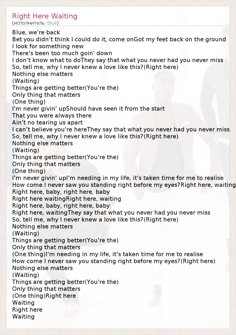 Blue, we're back Bet you didn't think I could do it, come onGot my feet back on the ground I look for something new There's been too much goin' down I don't know what to doThey say that what you never had you never miss So, tell me, why I never knew a love like this?(Right here) Nothing else matters (Waiting) Things are getting better(You're the) Only thing that matters (One thing) I'm never givin' upShould have seen it from the start That you were always there Ain't no tearing us apart I can't believe you're hereThey say that what you never had you never miss So, tell me, why I never knew a love like this?(Right here) Nothing else matters (Waiting) Things are getting better(You're the) Only thing that matters (One thing) I'm never givin' upI'm needing in my life, it's taken time for me to realise How come I never saw you standing right before my eyes?Right here, waiting Right here, baby, right here, baby Right here waitingRight here, waiting Right here, baby, right here, baby Right here, waitingThey say that what you never had you never miss So, tell me, why I never knew a love like this?(Right here) Nothing else matters (Waiting) Things are getting better(You're the) Only thing that matters (One thing)I'm needing in my life, it's taken time for me to realise How come I never saw you standing right before my eyes?(Right here) Nothing else matters (Waiting) Things are getting better(You're the) Only thing that matters (One thing)Right here Waiting Right here Waiting