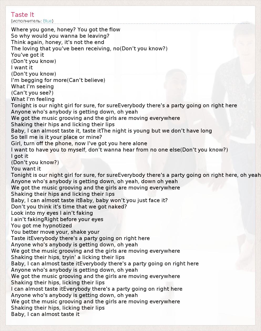 Where you gone, honey? You got the flow So why would you wanna be leaving? Think again, honey, it's not the end The loving that you've been receiving, no(Don't you know?) You've got it (Don't you know) I want it (Don't you know) I'm begging for more(Can't believe) What I'm seeing (Can't you see?) What I'm feeling Tonight is our night girl for sure, for sureEverybody there's a party going on right here Anyone who's anybody is getting down, oh yeah We got the music grooving and the girls are moving everywhere Shaking their hips and licking their lips Baby, I can almost taste it, taste itThe night is young but we don't have long So tell me is it your place or mine? Girl, turn off the phone, now I've got you here alone I want to have you to myself, don't wanna hear from no one else(Don't you know?) I got it (Don't you know?) You want it Tonight is our night girl for sure, for sureEverybody there's a party going on right here, oh yeah Anyone who's anybody is getting down, oh yeah, down oh yeah We got the music grooving and the girls are moving everywhere Shaking their hips and licking their lips Baby, I can almost taste itBaby, baby won't you just face it? Don't you think it's time that we got naked? Look into my eyes I ain't faking I ain't fakingRight before your eyes You got me hypnotized You better move your, shake your Taste itEverybody there's a party going on right here Anyone who's anybody is getting down, oh yeah We got the music grooving and the girls are moving everywhere Shaking their hips, tryin' a licking their lips Baby, I can almost taste itEverybody there's a party going on right here Anyone who's anybody is getting down, oh yeah We got the music grooving and the girls are moving everywhere Shaking their hips, licking their lips I can almost taste itEverybody there's a party going on right here Anyone who's anybody is getting down, oh yeah We got the music grooving and the girls are moving everywhere Shaking their hips, licking their lips Baby, I can almost taste it