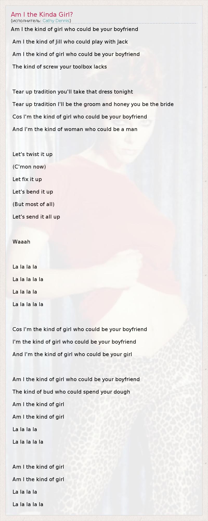 Am I the kind of girl who could be your boyfriend Am I the kind of Jill who could play with Jack Am I the kind of girl who could be your boyfriend The kind of screw your toolbox lacks Tear up tradition you'll take that dress tonight Tear up tradition I'll be the groom and honey you be the bride Cos I'm the kind of girl who could be your boyfriend And I'm the kind of woman who could be a man Let's twist it up (C'mon now) Let fix it up Let's bend it up (But most of all) Let's send it all up Waaah La la la la La la la la la La la la la La la la la la Cos I'm the kind of girl who could be your boyfriend I'm the kind of girl who could be your boyfriend And I'm the kind of girl who could be your girl Am I the kind of girl who could be your boyfriend The kind of bud who could spend your dough Am I the kind of girl Am I the kind of girl La la la la La la la la la Am I the kind of girl Am I the kind of girl La la la la La la la la la