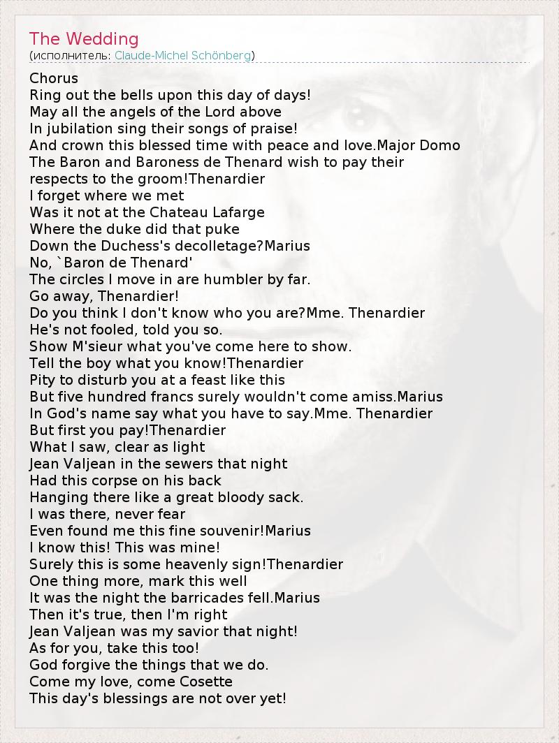 Chorus Ring out the bells upon this day of days! May all the angels of the Lord above In jubilation sing their songs of praise! And crown this blessed time with peace and love.Major Domo The Baron and Baroness de Thenard wish to pay their respects to the groom!Thenardier I forget where we met Was it not at the Chateau Lafarge Where the duke did that puke Down the Duchess's decolletage?Marius No, `Baron de Thenard' The circles I move in are humbler by far. Go away, Thenardier! Do you think I don't know who you are?Mme. Thenardier He's not fooled, told you so. Show M'sieur what you've come here to show. Tell the boy what you know!Thenardier Pity to disturb you at a feast like this But five hundred francs surely wouldn't come amiss.Marius In God's name say what you have to say.Mme. Thenardier But first you pay!Thenardier What I saw, clear as light Jean Valjean in the sewers that night Had this corpse on his back Hanging there like a great bloody sack. I was there, never fear Even found me this fine souvenir!Marius I know this! This was mine! Surely this is some heavenly sign!Thenardier One thing more, mark this well It was the night the barricades fell.Marius Then it's true, then I'm right Jean Valjean was my savior that night! As for you, take this too! God forgive the things that we do. Come my love, come Cosette This day's blessings are not over yet!