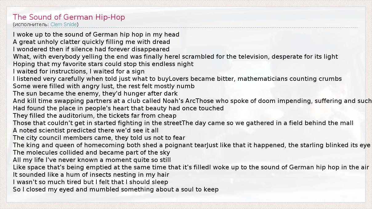 ГлавнаяИсполнителиClem SnideThe Sound of German Hip-Hop