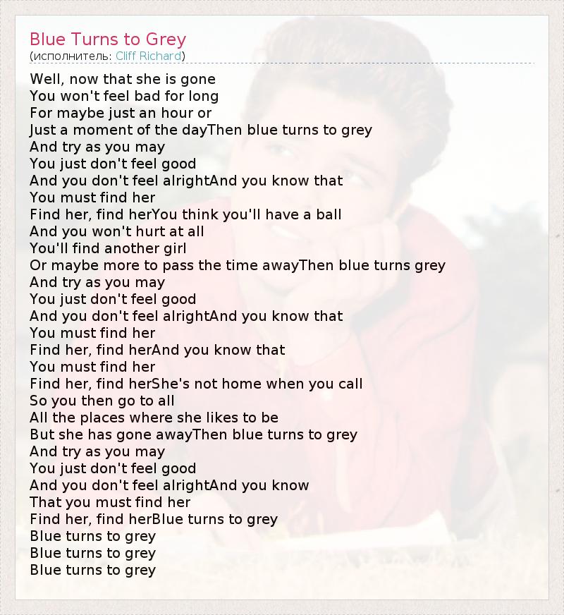 Well, now that she is gone You won't feel bad for long For maybe just an hour or Just a moment of the dayThen blue turns to grey And try as you may You just don't feel good And you don't feel alrightAnd you know that You must find her Find her, find herYou think you'll have a ball And you won't hurt at all You'll find another girl Or maybe more to pass the time awayThen blue turns grey And try as you may You just don't feel good And you don't feel alrightAnd you know that You must find her Find her, find herAnd you know that You must find her Find her, find herShe's not home when you call So you then go to all All the places where she likes to be But she has gone awayThen blue turns to grey And try as you may You just don't feel good And you don't feel alrightAnd you know That you must find her Find her, find herBlue turns to grey Blue turns to grey Blue turns to grey Blue turns to grey
